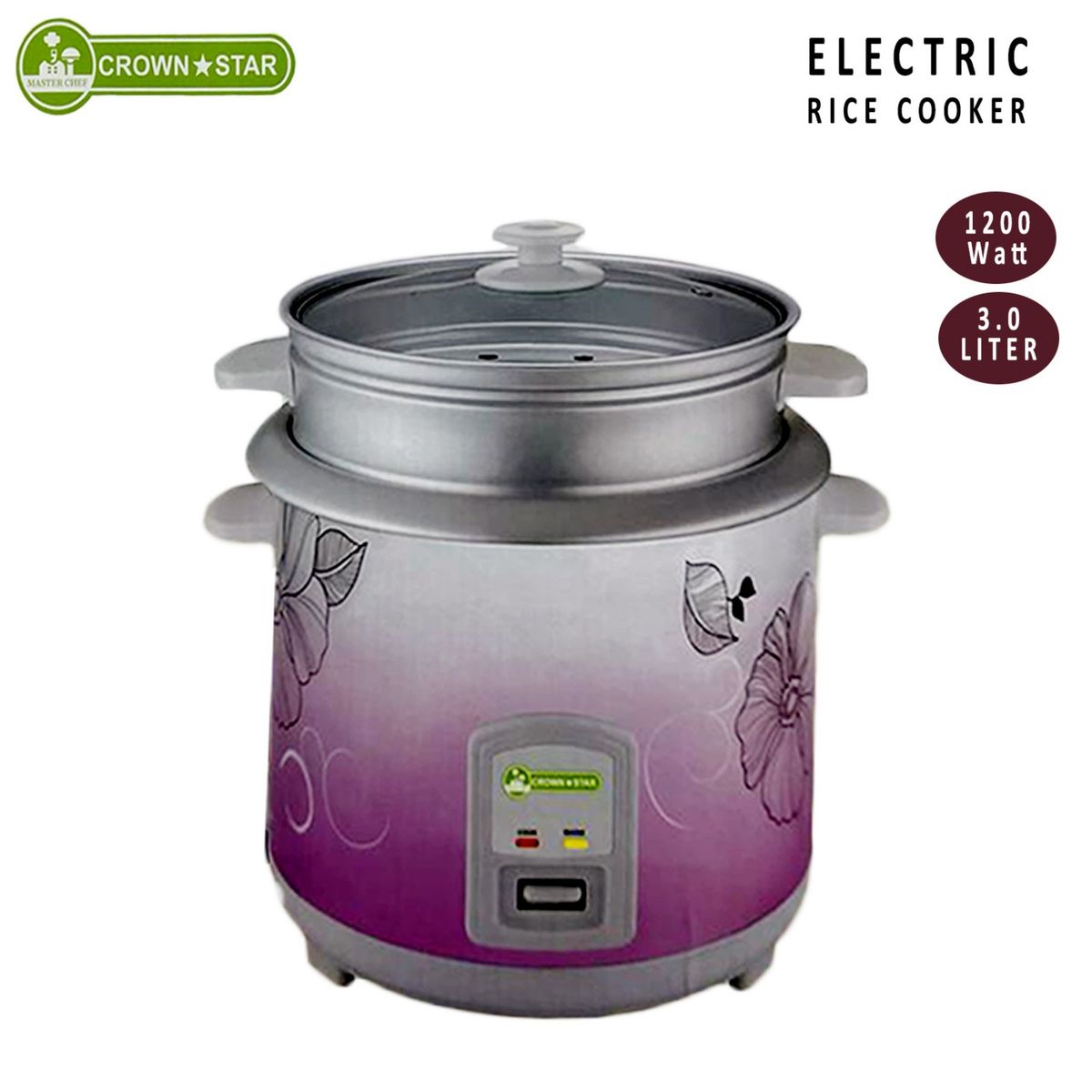 liter Crown Star rice cooker comes in a cylindrical shape with steamer. Traditional mechanic control with an aluminum inner pot with coating and glass lid on top.