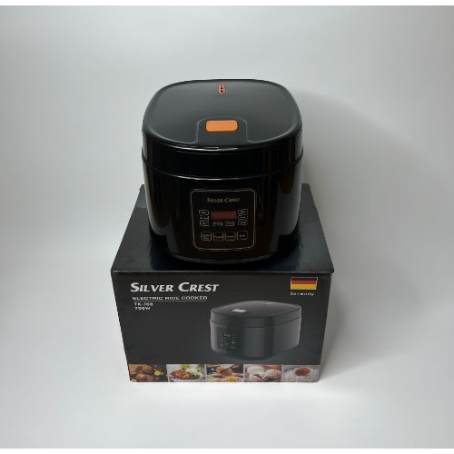 This 3 liter Crown Star rice cooker comes in a cylindrical shape with steamer. Traditional mechanic control with an aluminum inner pot with coating and glass lid on top.