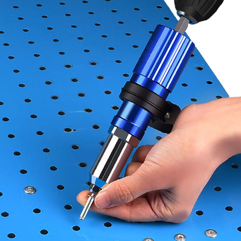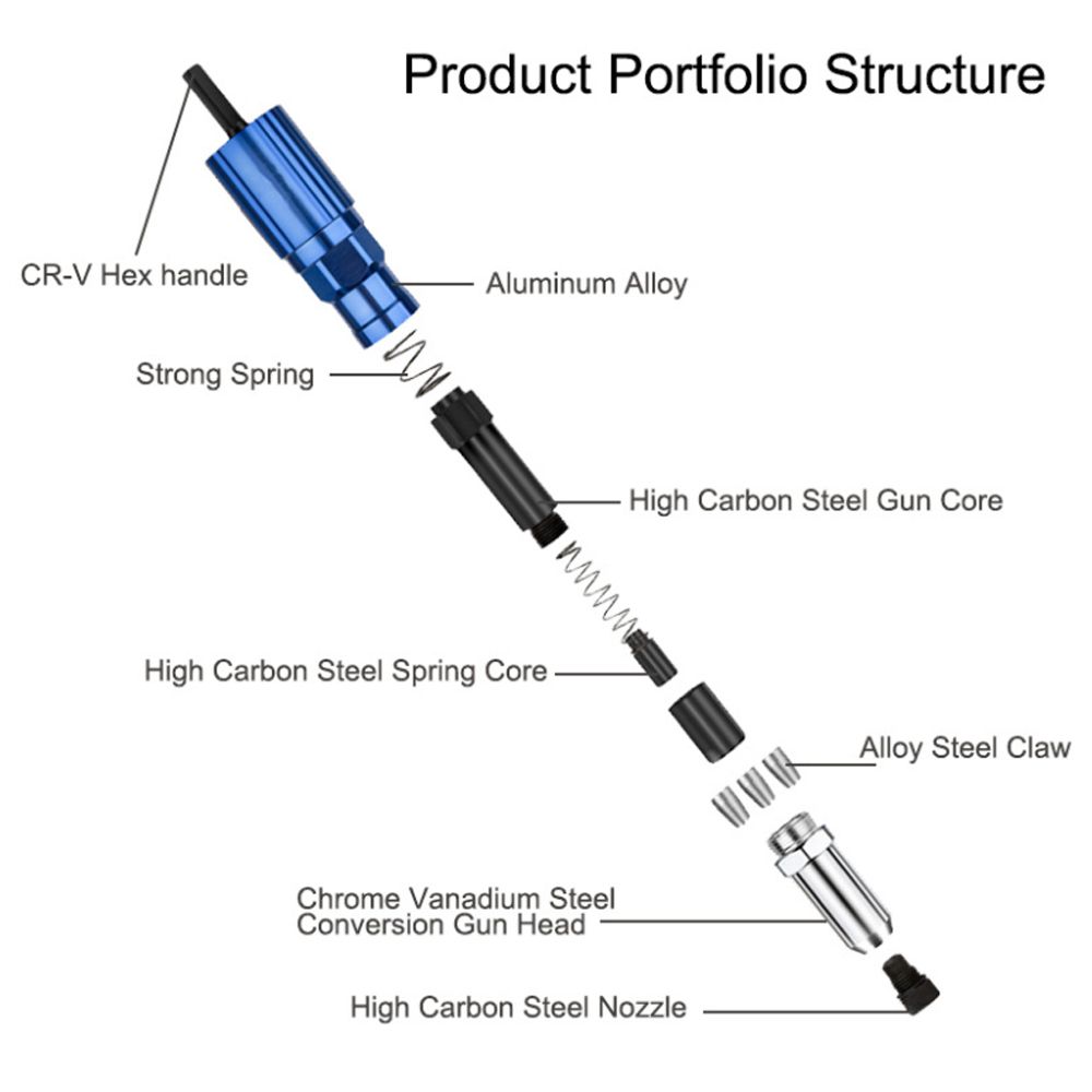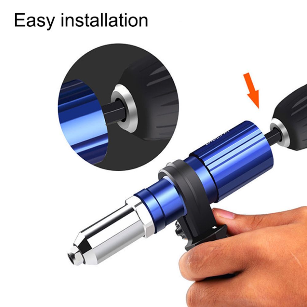 Steps for usage 1.Adjust the electric drill to the appropriate gear 2.Open the drill chuck and insert the adapter 3.Turn on the drill reversal function, ar hearing the sound 4.Put in rivets of appropriate specifications 5.Turn on the electric drill, align the holes, and drive in the rivets 6.Turn on the reversal function of the electric drill and exit the rivet