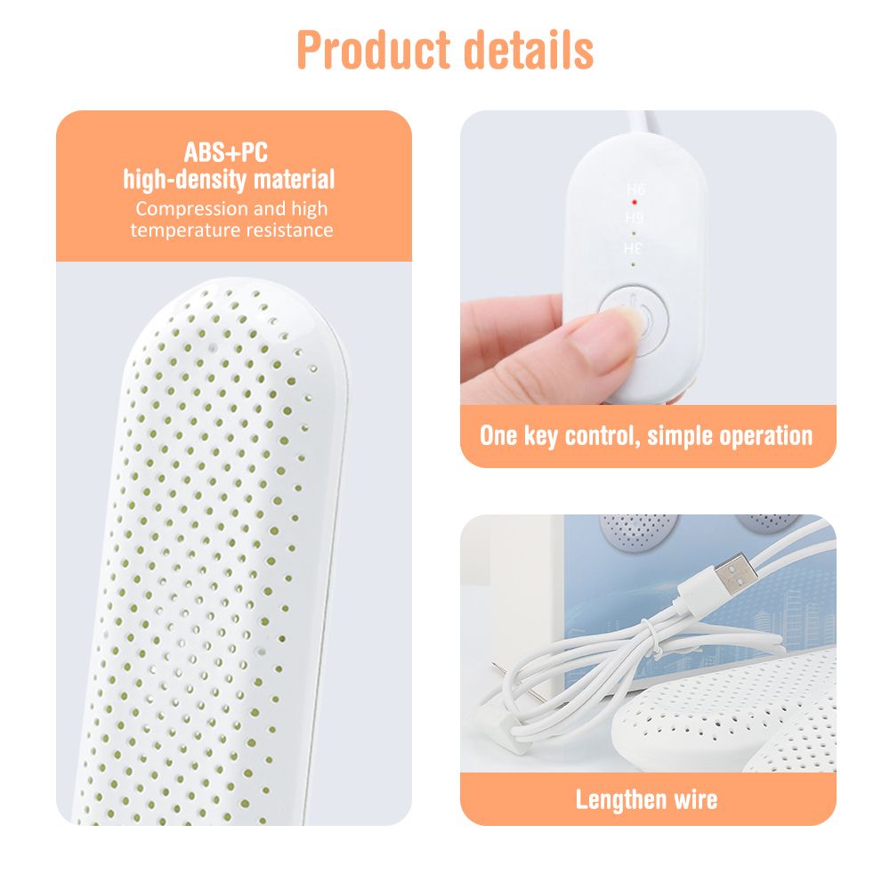 Features: 1.The shoe dryer has a built-in PTC heating element with a core temperature of up to 15℃. Through high temperature and drying, the living envment of microorganisms is destroyed, and the odor is removed while inhibiting the growth of microorganisms. 2.Two heating elements are respectively placed at both ends of the ring-shaped shoe drying device, which can evenly diipate heat, accelerate the eation of water, and dry the wet shoes faster. 3.The unit is densely distributed with 1532 heat diipation holes, forming a ring-shaped warm air flow in the shoe, taking into account the sole and the upper, and even the dead corners can be dried evenly. 4.With a built-in smart timer, you are free to choose 3/6/9H to suit different shoes. It will shutdown automatically so you can go out without any safety concern.