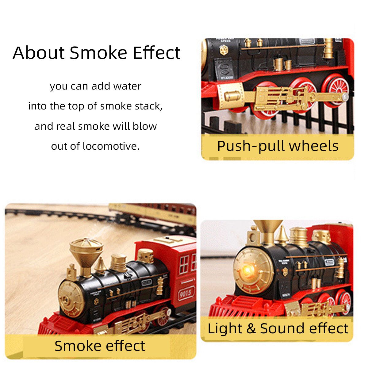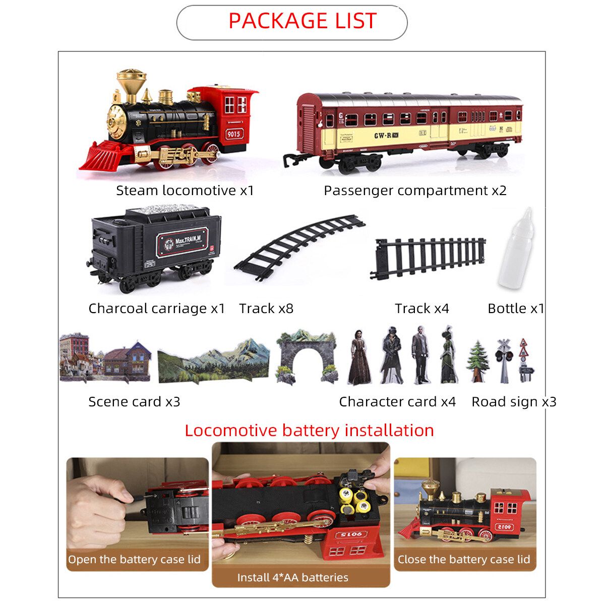 ◆ HEADLIGHT, SOUNDS SMOG- The electric train model also features authentic LED light, sounds. Moreover, you can add water into the top of smogstack, and real smogwill blow out of locomotive. Locomotive Engine require 4 AA Batteries, not included.
