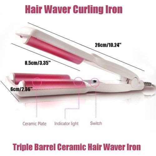 Electric Triple Barrel Curling Iron Perm Splint Ceramic Hair Curler 3 Barrels Wave Hair Waver Curlers Styling Tools Description: Type:Hair Waver Curlers Material:ABS+PTC ceramic heating :White+Rose Red Voltage:AC 110-240V Power:40-50W Temperature:180℃ Diameter of Thermal Conductor: 20mm Size:approx.26x8.5x6cmcm/10.24x.35x2.36" Package Included: 1X Hair Waver Curlers Feature: 100% and high quality. Made of high temperature ABS resin plastic shell, using the latest environmentally friendly nano-titanium ceramic coating technology heating plate, to ensure uniform heat, does not damage the hair, heating body for the of PTC (thermal ceramic heating ) rapid warming! 30s rapid temperature rise, temperature does not hurt hair, constant and lasting, creating an ideal long-lasting shape! Perfect for you to make a wonderful hair when you are at home. Operation: 1.Before using the plug into the power outlet, see the light, the curlers began to heat. 2.Preheating, then reached the highest temperature, operational use. 3.Before using the hair comb along, and partition, from behind a ray of strands of operation. Such as the initial use, it is recommended in the state of the lower power is not familiar with the operating practices! 4.The use of finished, should be turned off / cut off the power until the natural cooling before storage. Notice: 1.The real of the item may be slightly different from the pictures on website caused by many factors such as brightness of your and light brightness. 2.Please allow slight deviation for the measurement data. 3.Please allow 1-3cm error. Ifyouhaveanyquestions,pleasecontactus. Wishyouhaveahappyshoppingtime! Detail Image