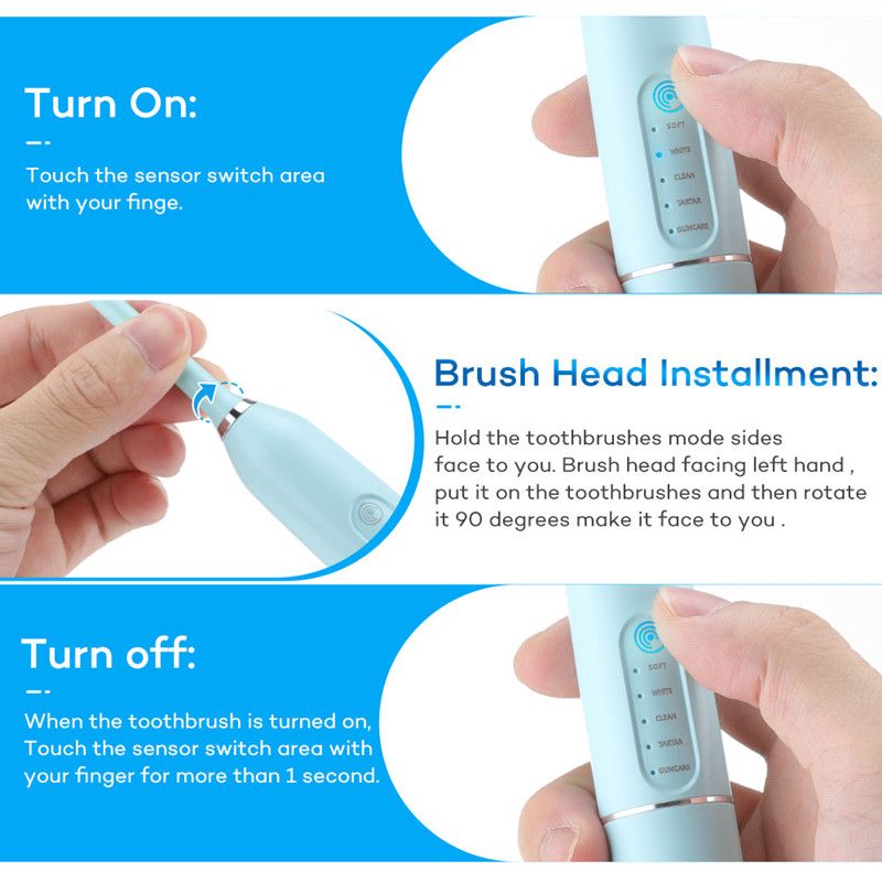 4. Multiple accessories—Three replaceable toothbrush heads can be used for daily tooth cleaning, and two high-quality medical grade alloy steel replacement heads can be used to remove tartar, tea stains, and smoke stains.