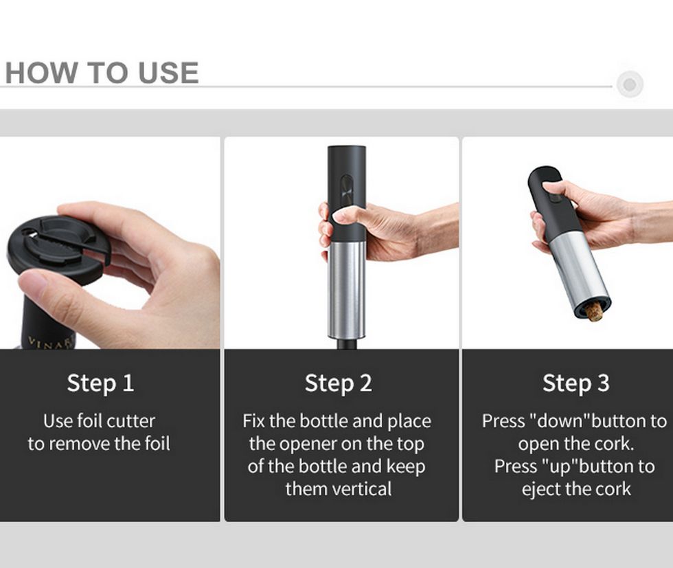 Press down, hold button, wine is opened within moments! No messy broken corks. Press upper button, release the cork, automatic, and perfect when we decide to be a lazy person who doesn't want to bother with a manual opener.