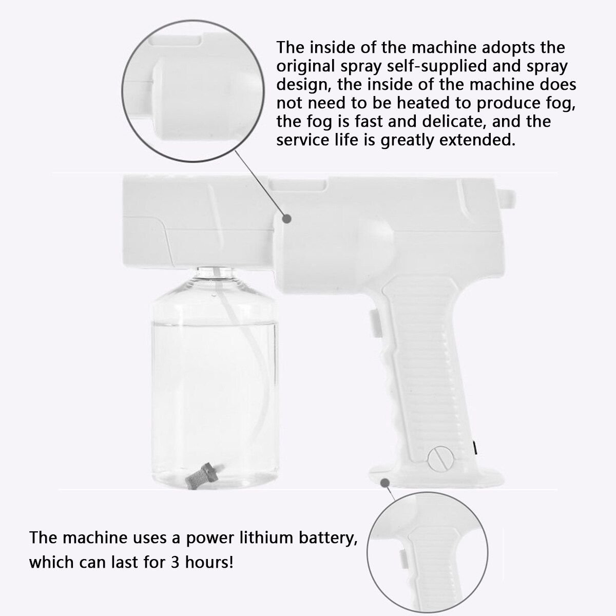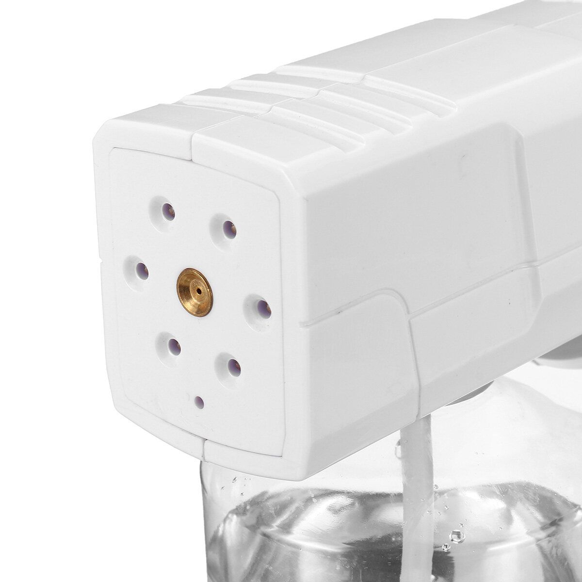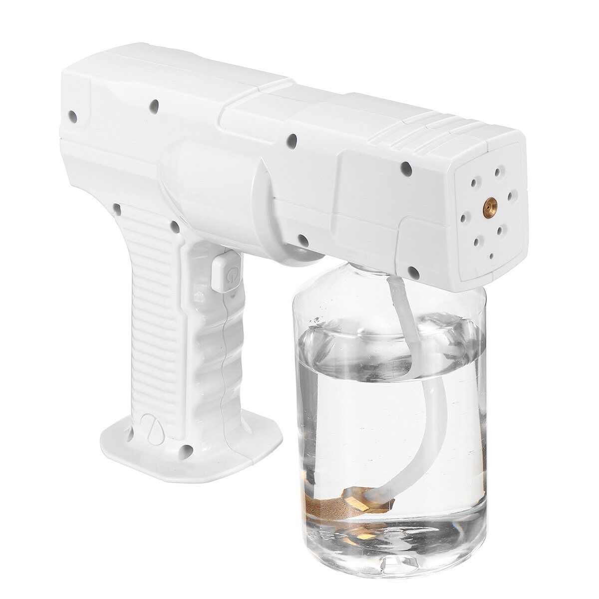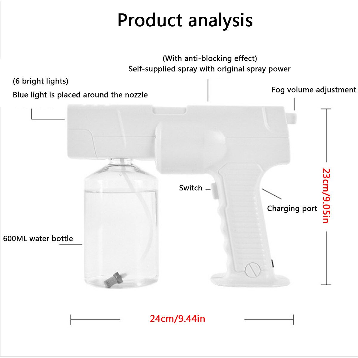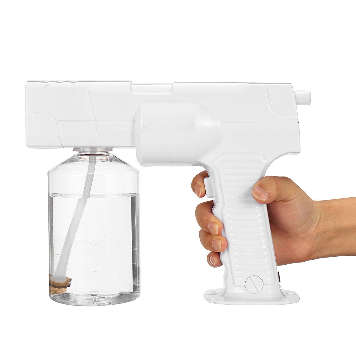 Updated 600ML Portable Wireless Sprayer Machine Disinfection Blue Light Nano Steam Spray Disinfection Nano Spray Atomizing SprayerFeatures:?The inside of the machine adopts the spray self-supplied and spray design, the inside of the machine does not need to be heated to produce fog, the fog is fast and delicate, and the service life is greatly extended.?Electric , powerful life, available for 150 minutes on one charge?High-quality nano spray port, using PA high temperature resistant material, fast fogging, large amount of fog?Porous heat dissipation, the device releases a large amount of nano-spray while the fuselage intelligent heat dissipation.?Nano-infiltration, hair deep nourishment, Pressurize the water from saturated steam to 133 degrees.a superheated mist molecule having a diameter of about 0.5 nm, Smoothly penetrates the scales with a of about 1 nanometer, Achieve the hot, dyed, and protective hair of the hair.?Spray regulatorAccording to the and hard hair Freely adjust the amount of fog?Large-capacity water bottle, which can adjust the control time according to the amount of fog.Specifications:: WhiteBattery: Built-in 2600 mAh rechargeable batterySize: 23*24cm/9.05*9.45inMaterial: PlasticWater Bottle Capacity: 600MLSpray diameter: 0.5nm : 1400WRated Voltage: 110V~220V 50HZCharging time: 2hUsage time: 3hNet weight: 8.3KGGross weight: 9KGCertification: CEPackage List:1 × Nano steam guNote:1. Please allow 0.5-1cm differences due to manual measurement.2. Due to the light and screen difference, the item's may be slightly different from the pictures.