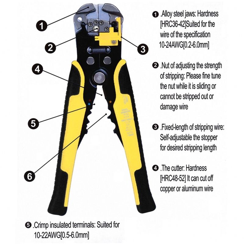 - 8-inch self-adjusting wire stripper strips wire from 10~22 AWG automatically.