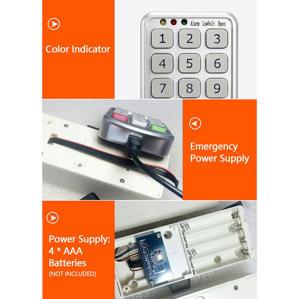 Features:3 colors indicator light: red for low voltage, yellow for password error alarm, green for lock opening.