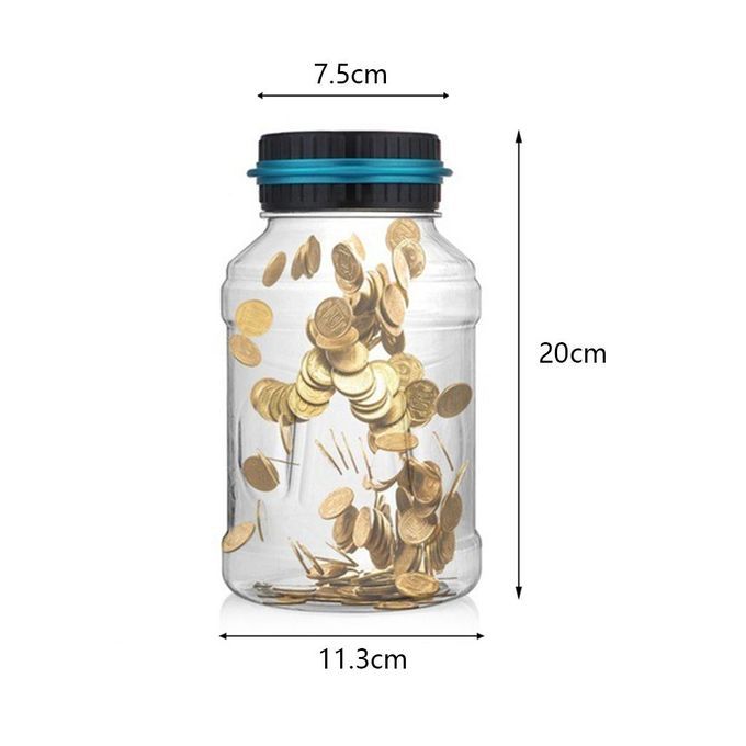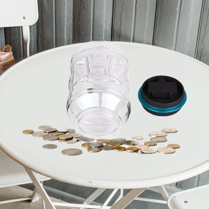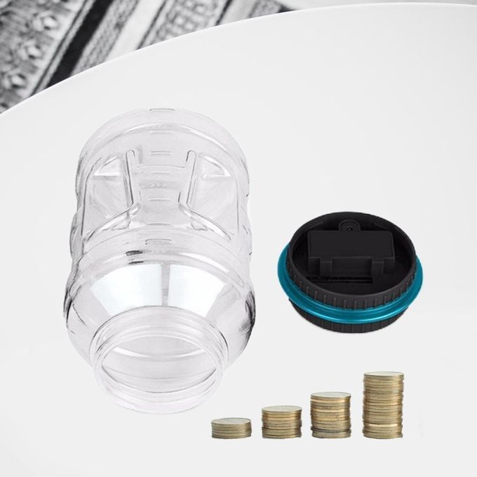LCD screen--This clear jar has a LCD screen on a lid, powered by 2*AAA batteries (not included), helps count your coins as they slip through the slot. It accurately counts your money and display the total for every deposit.