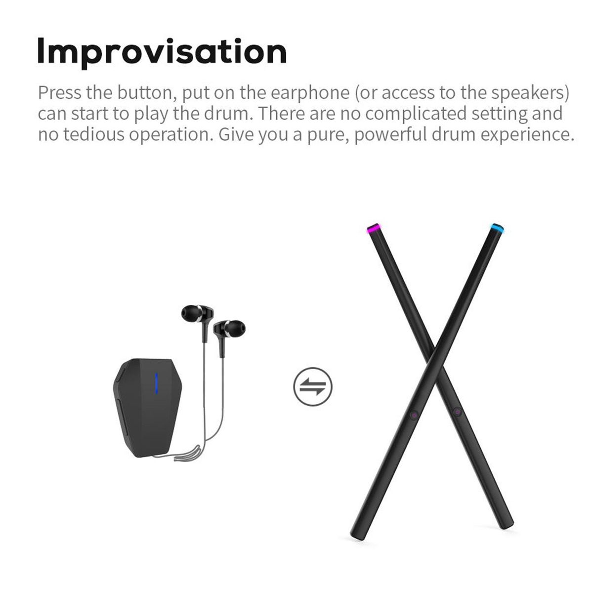 Press the button, put on the earphone(or access to the speakers) can start to play the drum. There are no complicated setting and no tedious operation. Give you a pure, powerful drum experience.