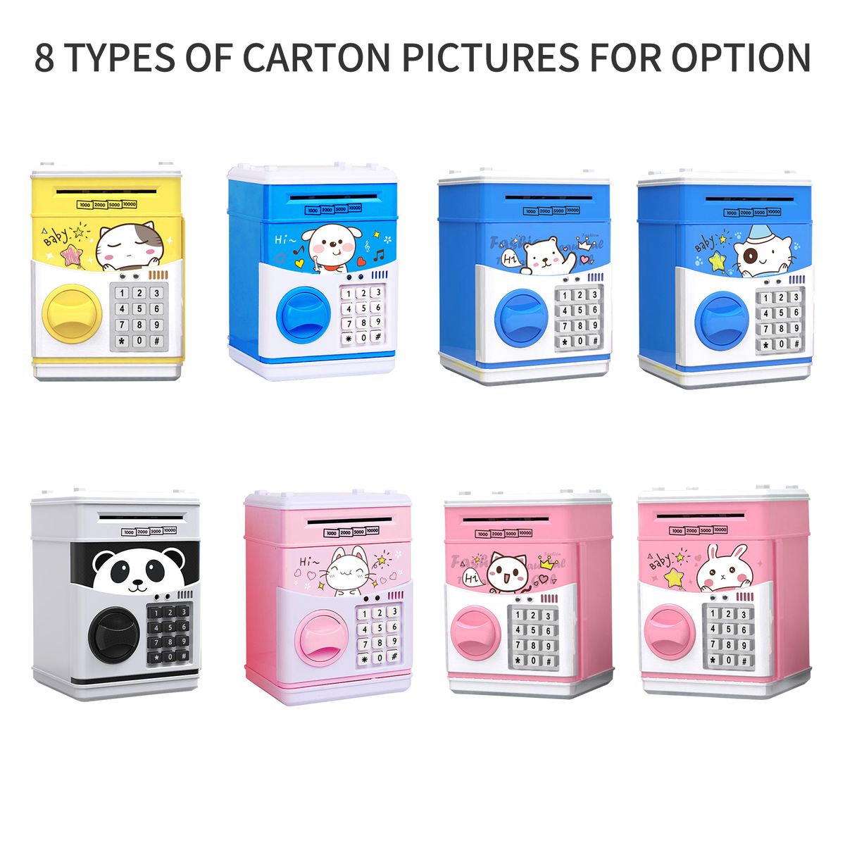 Large space - Very large space, not only can storage money, also can deposit a few illicit close gadgets among them. And there are 8 types of colors and pictures of piggy bank for you to choose the favourite.