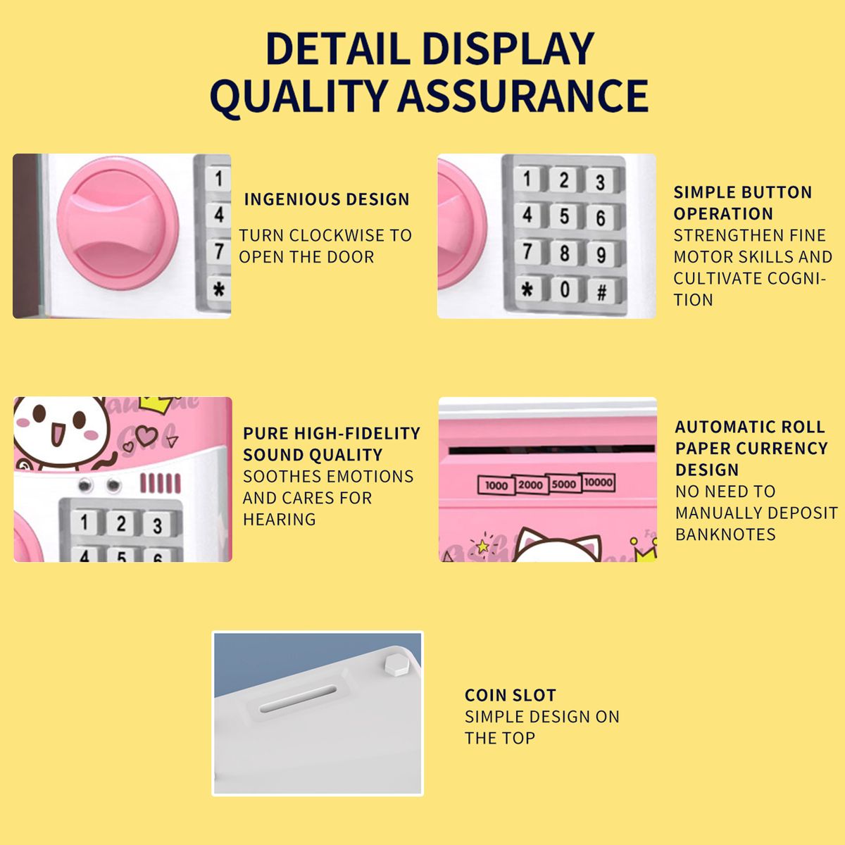 Interesting Piggy Bank - Can be used to store toys, jewelry, bankbooks, etc. The slot in the coin slot can hold coins or paper money. 11 songs are setting in the piggy bank, when rolling the money and open the bank, the music will play, interesting, right?