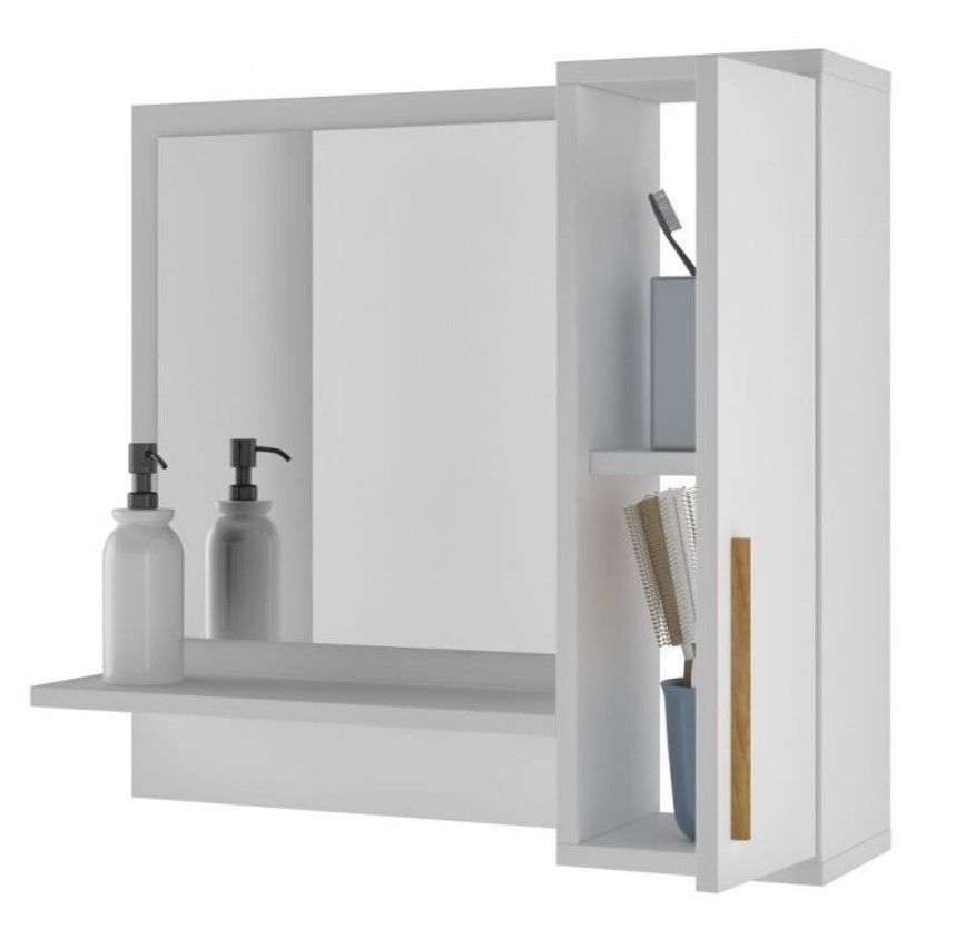 open shelf mirrored cabinet will keep clutter from taking over your sink surface. You can tuck your toiletries away behind the mirrored door for a tidy, neat bathroom. The shelves are perfect for popping on a reed diffuser or some trinkets to pretty up the space. The mirror helps the room to feel brighter and lighter, as well as giving you a place to check your look before you leave for the day. Made from MDF with a painted finish. 1 door. 3 shelves . Complete with fixtures and fittings. Size H60, L70, D14cm. Self-assembly. If this product is over 60cm high it must be securely attached to the wall to prevent overturning. General information: Manufacturer's 1 year guarantee