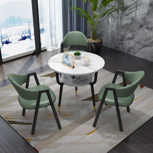 Cafe dining set with matching sits.the table is silicon hard glass and solid metal support.Has quality leather settee.there are four seats in all, constructed with stainless steel and properly balanced on the ground.