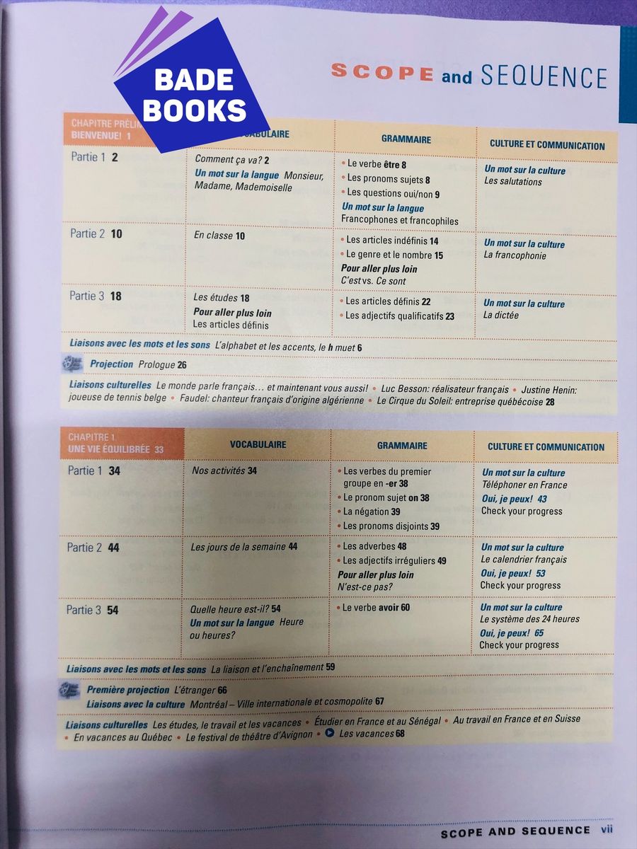 The basic principles of pronunciation and grammar of the French language are emphasized. Vocabulary dealing with everyday situations is covered. Listening and speaking skills are developed through laboratory practice and increased use of FrenchThis book stresses progress in the speaking, writing and reading skills and promotes greater understanding of French culture. The mandatory use of laboratory tapes further develops listening and speaking skills.