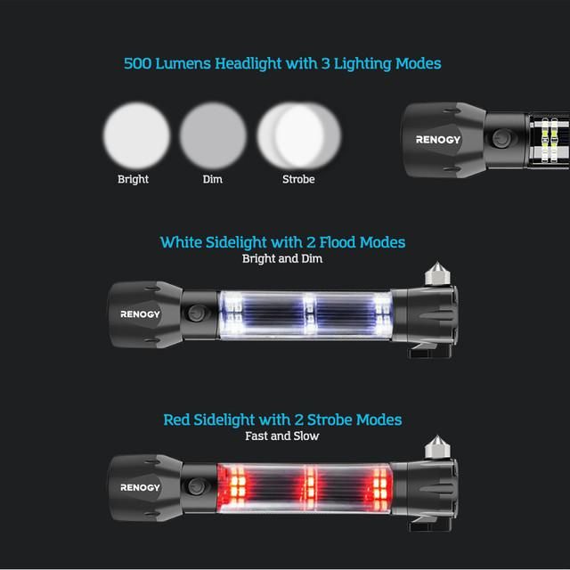 Equipped with a solar panel, the Renogy E.LUMEN 500 Multi-functional Flashlight harnesses the power of the sun to light your way in the dark. Ready to power up your mobile devices at any time, glass shattering hammer, and magnetic attachment will have you prepared for vehicle emergencies and outdoor activities.