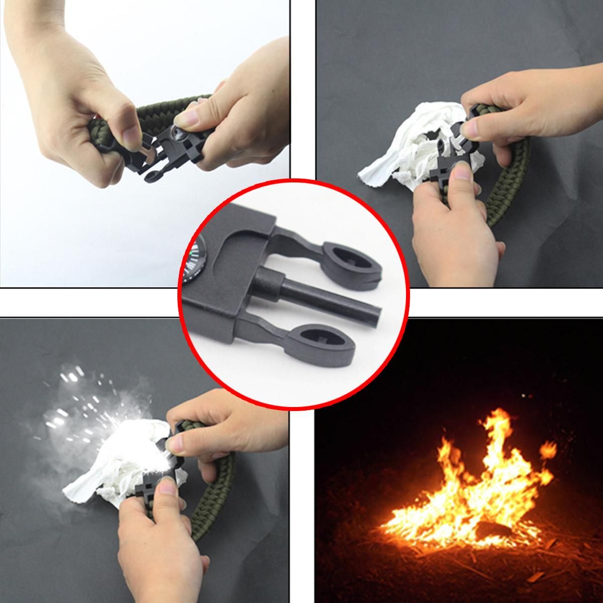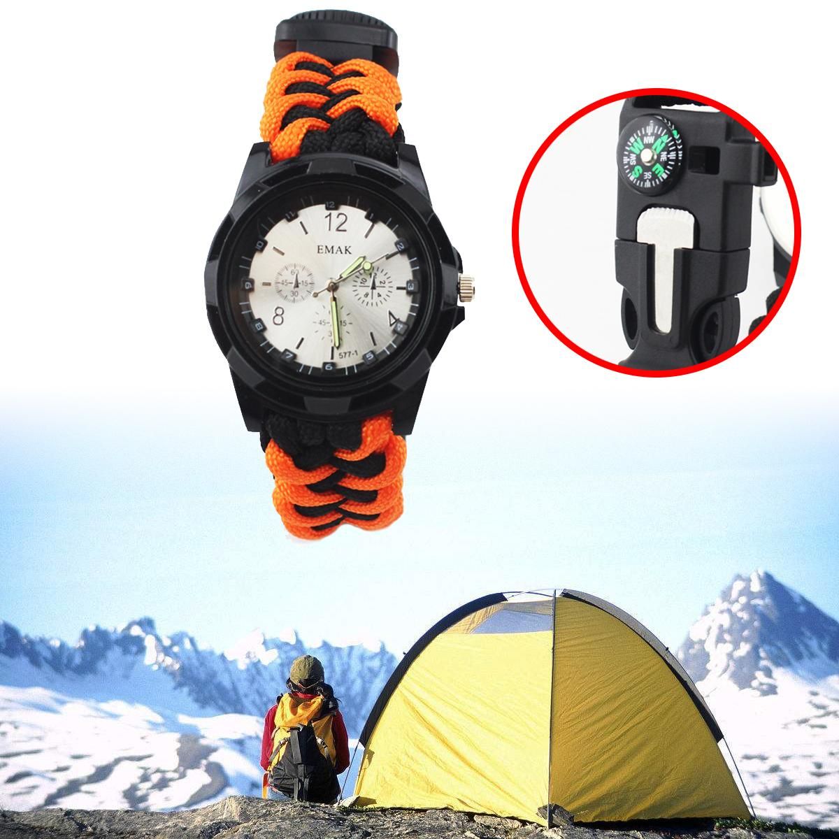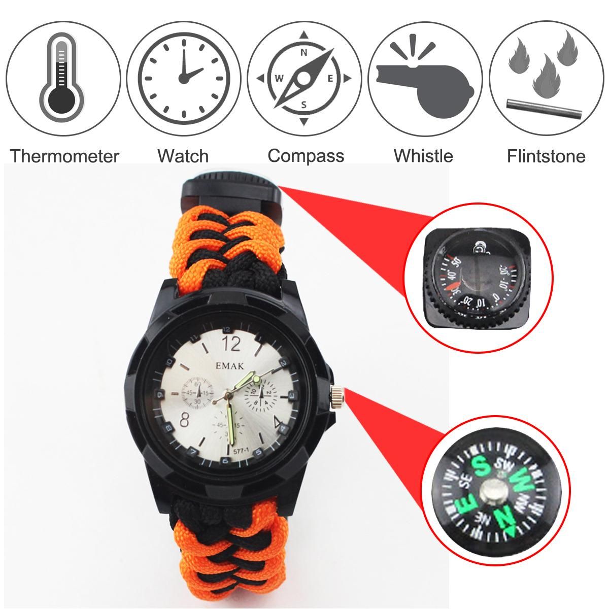 1.7 IN 1 SURVIVAL EMERGENCY KIT: The outdoor survival bracelet with compass, loud Whistle, Fire stick, watches, rope, thermometer, cutter.