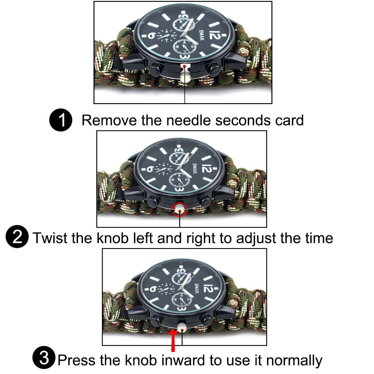 Function: 1 survival whistle, 2 Fire stick, 3 compass, 4 watches, 5 rope, 6 thermometer, 7 cutter