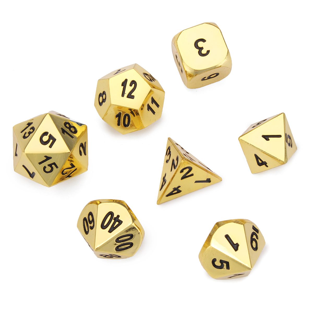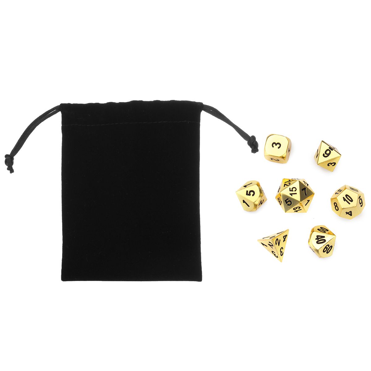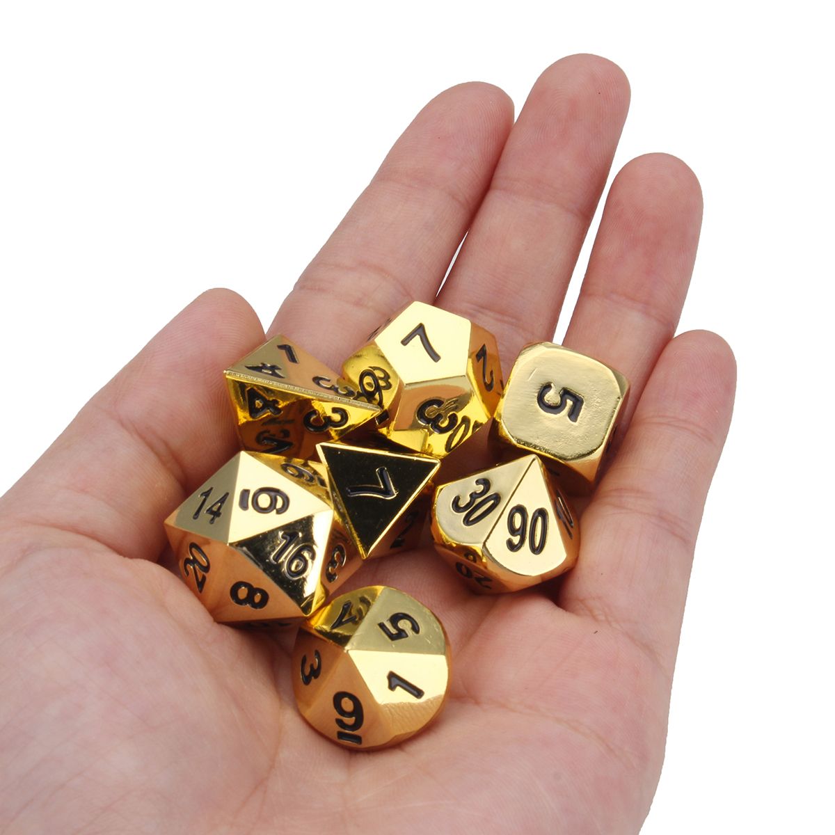 Specification Name: 7Pcs Polyhedral Metal Dice Set Model: 862358 : gold / ancient bronze / ancient tin / black nickel Size: Dice Style:Length x Height x Width D4: 14mm X 13mm X 14mm D6: 10mm X 10mm X 10mm D8: 13mm X 10mm X 10mm D10: 12mm X 10mm X 13mm D12: 13mm X 12mm X 13mm D20: 13mm X 13mm X 13mm D100/10: 12mm X 10mm X 13mm ? Feature One 4 sided D4 Metal Dice Brushed Steel Finish One 6 sided D6 Metal Dice Brushed Steel Finish One 8 sided D8 Metal Dice Brushed Steel Finish One 10 sided D10 Metal Dice Brushed Steel Finish One 10 sided D100 Metal Dice Brushed Steel Finish One 12 sided D12 Metal Dice Brushed Steel Finish One 20 sided D20 Metal Dice Brushed Steel Finish This is a full set of metal dice which feel great in the hand with their heavy weight. They also roll well and bounce nicely on any game surface. This set comes complete with 7 metal dice in total and a dice bag for easy access. Metal Dice with a Brushed Steel Finish and Black Numbers. Numbers are written clearly and numerically rather than with pips for easier identification. ? Package Included 1 set of metal dices (7 dices)