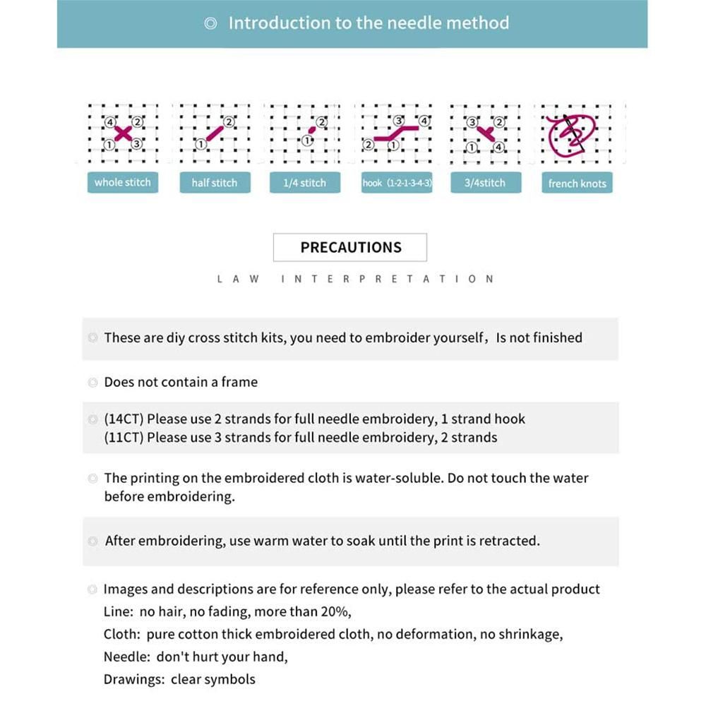 [Notes](11CT) use 3 strands for full .2 strands threads for back . After finishing. put the pattern in warm water for 20 minutes.then dry.and then you can make a for it as you like.→Important:→ do not the -stamped pattern wet you finish it because it is washable. Color blocks on the printed pattern are color of the floss. be to use the colored tread according to the symbols. Why Kits?