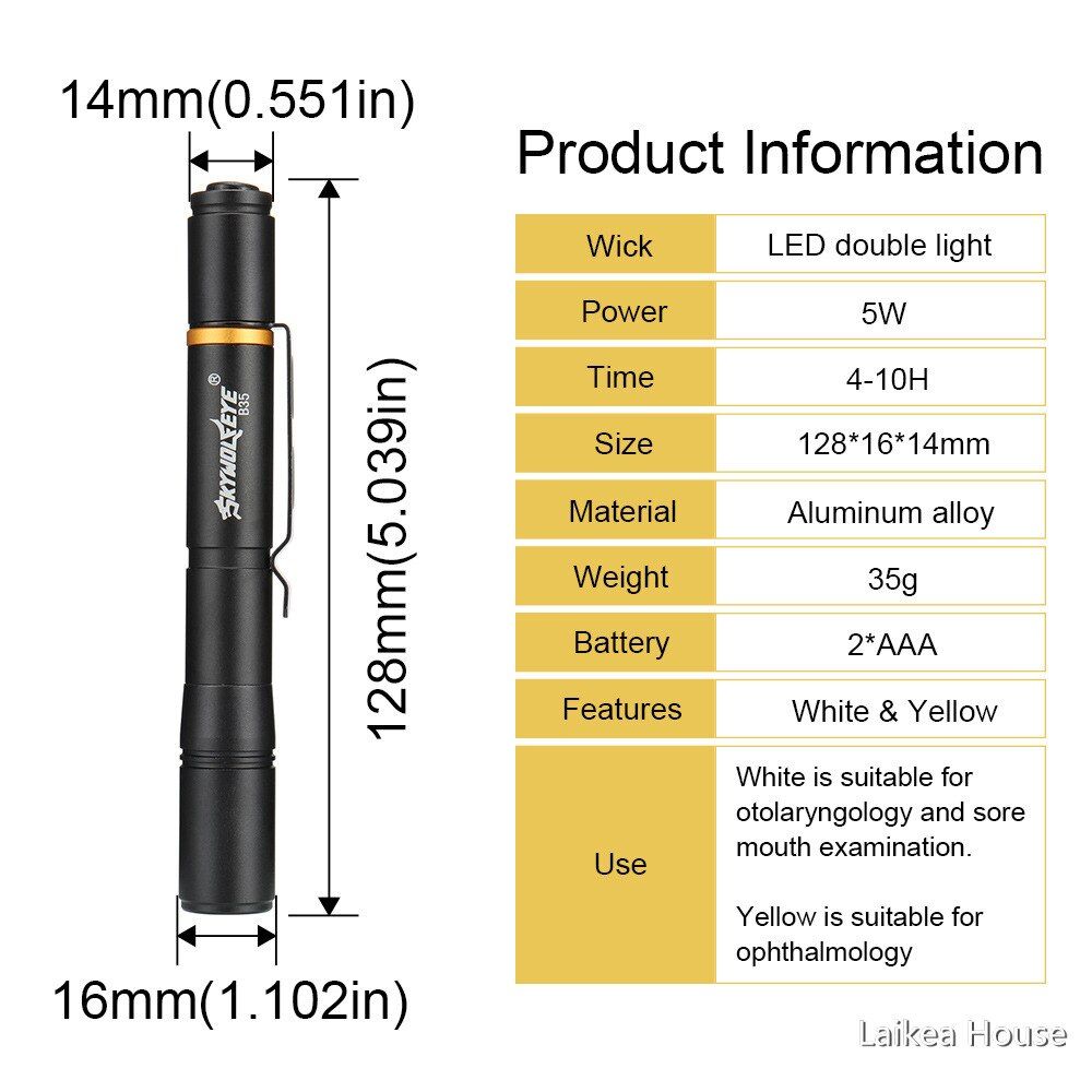 Portable, easy to carry and store With Tail-cap ON/OFF button, simple to use With strap on the tail cap, can be put in your pocket or hung on your bag Wide beam, great for lighting the path, intense spot penetrates deep into the darkne two modes (white light - yellow light) Scope of application: medical pen light, white light color clear for otolaryngology, sore mouth examination. The yellow light color is suitable for ophthalmology. Portable pen holder for easy carrying. Description Colour: Black Lamp type: LED dual light source (white light + yellow light) Size: 128*16*14mm Material: aluminum alloy Weight: 35g Use battery type: 2*AAA Use charger type: none Package Include: