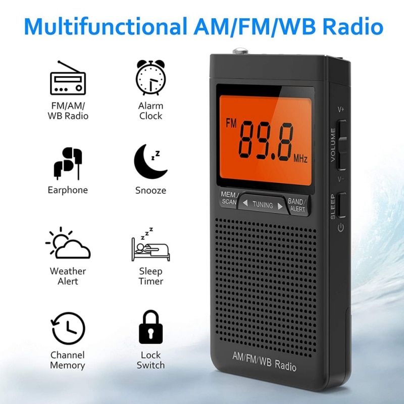 Product Features: NOAA Weather Alert: weather broadcasts from 7 NOAA stations at a crystal-clear sound. This NOAA weather radio can automatically monitor and alert hazardous weather in your areas like hurricanes, tornadoes, and severe storms that earns a critical time for you to get full preparation advance, keeping you and your family safe with this emergency radio. Keep on in your emergency bag, you will be relieved to have this weather radio. Best Reception with Auto-search and Pre-Set Channels: With updated DSP and external , this am FM radio captures a superior signal reception, you will not mi any AM FM stations. This weather radio can automatically search and save 20 AM or FM channels for you with convenience and an LCD screen for more visually to know the information. Buy one it daily uses, you can unwind to listen to news, music, and baseball games on this portable radio. EMERGENCY AAA BATTERIES POWERED: Powered by 2 AAA batteries (not included) to guaranty that you always stay connected in emergency situations such as a hurricane, tornado, or power outage. Our newest technology is energy efficient to ensure you maximize your battery life. MINI, COMPACT, AND SLIM DESIGN: Its mini, compact and portable design makes it easy to carry and store at your bag, pocket, or emergency drawer. THE PERFECT GIFT FOR YOUNG and ELDERLY: Radios are the perfect gift for your loved ones at any age! Its mini, compact and portable design makes it easy to carry and store at your bag, pocket, emergency drawer, when walking, jogging or camping outside. Product Specification: Type NOAA Emergency Pocket Radio Band AM/FM, Weather Band FM 87.5-108 MHZ AM 520-1710 kHz WB 162.400-162.550 MHZ Current Consumption ≤150mA Output Power ≥90mW Distortion ≤5% Input Voltage DC-3V (AAA*2) Power 2 x AAA batteries (not included) Function Turn on regularly, Sleep off, Standby warning, Early warning detection, Alarm clock Package Includes: 1 x NOAA Emergency Pocket Radio 1 x User Manual