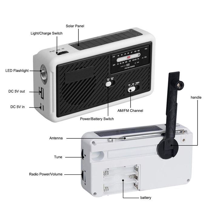 -Wide Application: Music player, LED lighting, Emergency alert, Phone charging, FM AM NOAA radio.