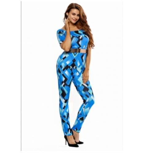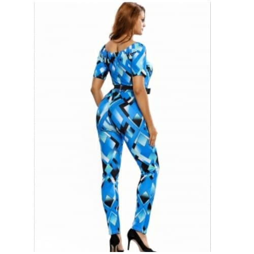 Buy Emfed- Bluish Geometric Print Belted Off Shoulder Jumpsuit in Nigeria