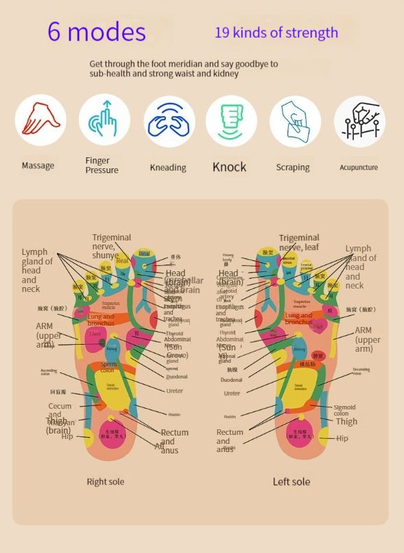 19 ADJUSTABLE INTENSITY - foot massager are 9 levels of adjustable intensity directly stimulate the acupuncture points, slow down physical and mental fatigue, improve sleeping.
