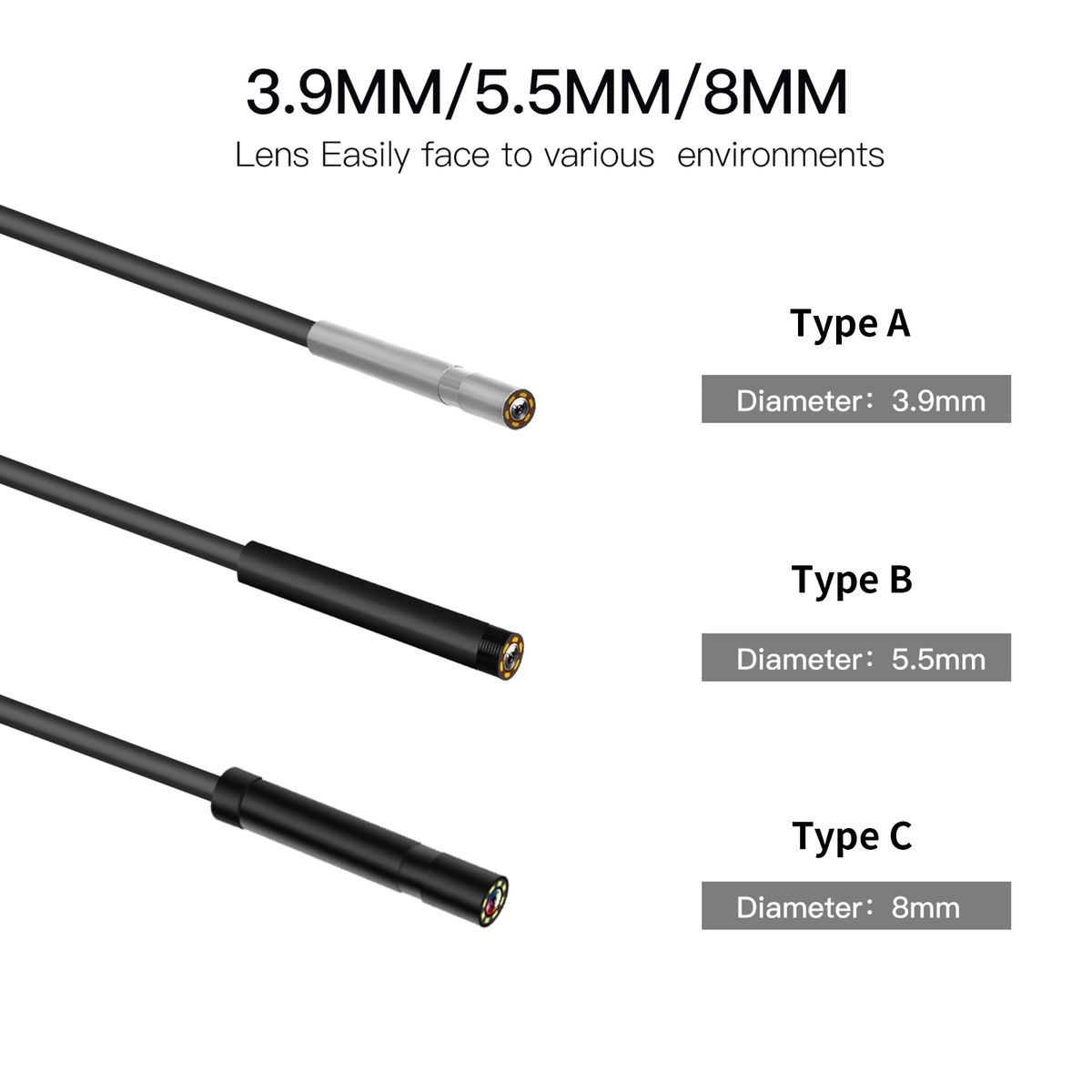 Features:3.9mm/5.5mm/8mm diameter camera to choose, 50mm to 5000mm focal length, allows clearer views and high definition images.