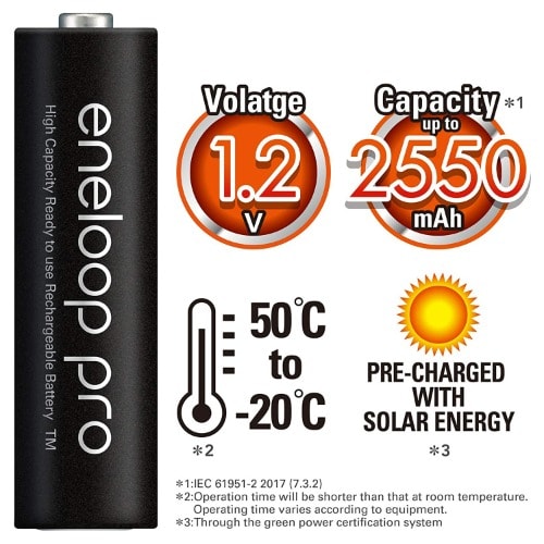 Advanced, individual battery charging, AA and AAA cells, four individual LED charging lights, battery detection technology & ndash; auto shut off, Panasonic brand name, and retractable plug. Fully charge eneloop pro AA cells in 9 hours, AAA in 7 hours (approx. ). AC100 & ndash; 240V, 50/60Hz * Based on IEC 61951-2(7.3.2). ** Battery life based on testing method established by IEC 61951-2(7.5.1.3). Results may vary based on conditions of use. *** As certified by The Green Energy Certification Center **** Storage at 20 & deg; (68F) ambient conditions (Discharge: . 2lt, E. V equals 1.0V) (varies according to conditions of use). eneloop batteries need a charger to be recharged. Panasonic Ni-MH battery charger recommended.