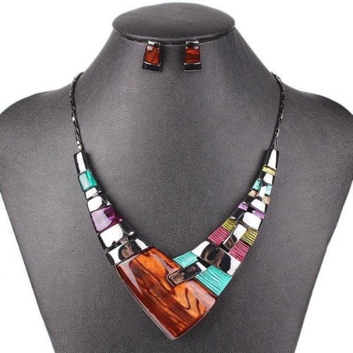 Dazzling geometric resin pendant necklace in an elegant aztec geometric design.Necklace measures approximately 19" around and finished with a toggle clasp.