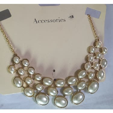 This vintage statement necklace is a white finish pearl studded in multilayer set in gold metal.