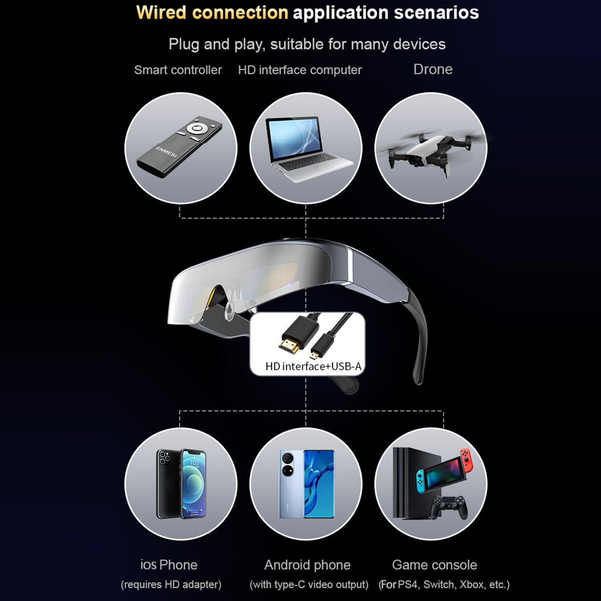 Versatile Connectivity: Connect the glasses to your TV, mobile phone, laptop, , player, or game console, and enjoy your favorite content on a big screen, anytime and anywhere.