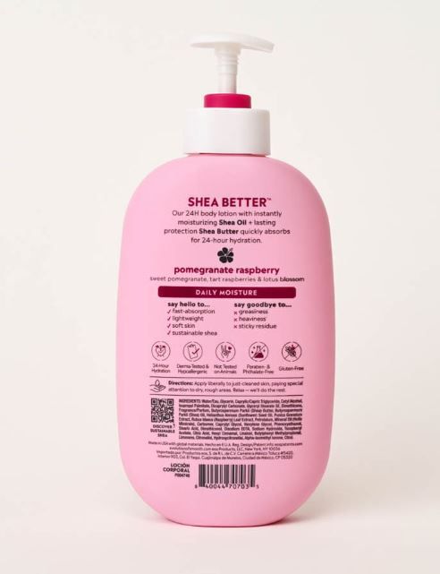 Sweet pomegranate, tart raspberries, and lotus blossom create our all-day moisturizing Raspberry Pomegranate Body Lotion. This pomegranate lotion combines the superpowers of lightweight shea oil and ultra-rich shea butter for both immediate moisture and lasting protection - that even lasts through hand-washing! Plus, our beautiful fragrances leave your hands smelling pretty great. It's like a pick-me-up for your skin that you'll never want to put down.