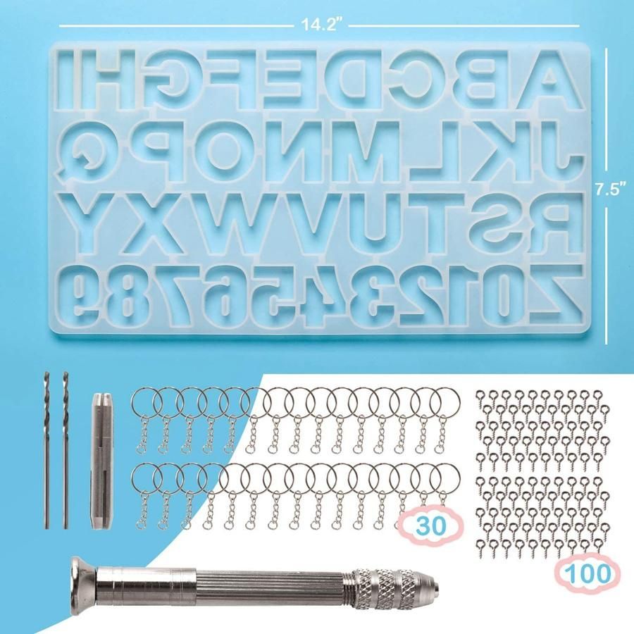 Mold Set 1x Hand Drill 2x Drill Bits 30x Keyrings 100xHelp you freely make your personalized trinkets and add color to your life.which make the letters mold is very flexible, no tearing. Key rings and screw eye pins are made of metal alloy.sturdy and durable. These assistant tools help you make DIY crafts more easily