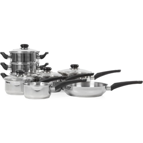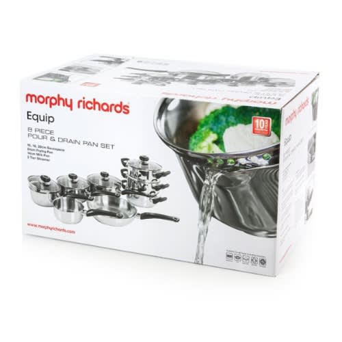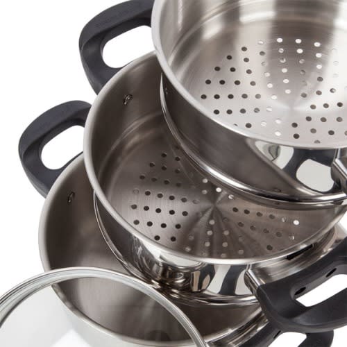 Get everything you need for preparing food in the kitchen with this eight-piece pan set. It includes three saucepans, a frying pan, milk pan and a three-tier steamer, each made from high-grade stainless steel.