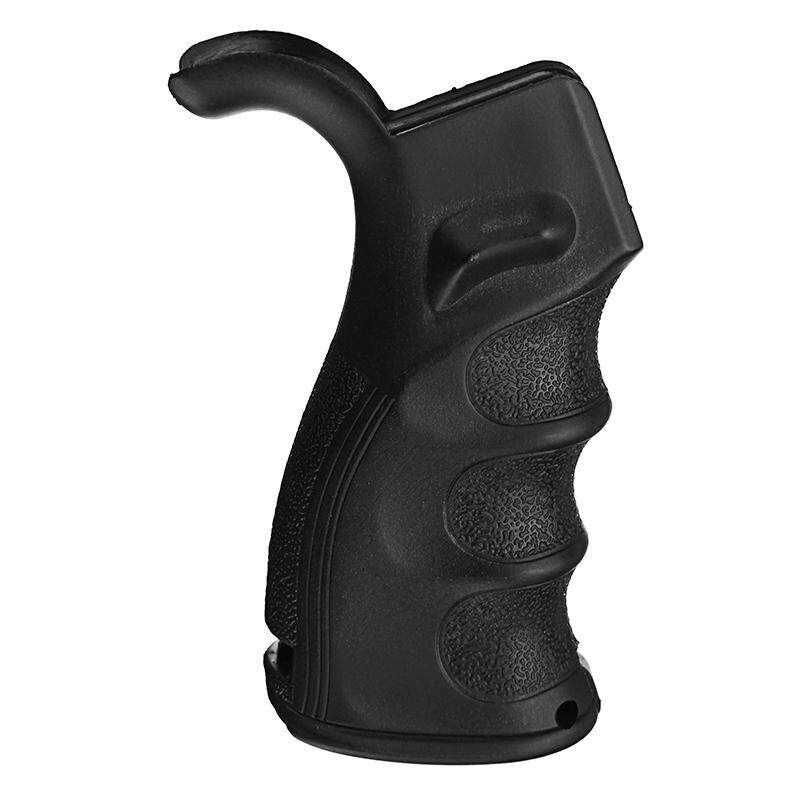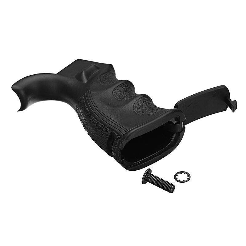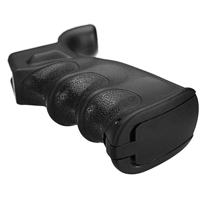 a.This is an ergonomic black grip with ambidextrous thumb rests. b.It also has a compartment underneath for batteries and/or small tools. .Increases operator comfort and performance, Providing more control during firing while reducing fatigue d.Finger grooves, palm swell and contoured backstrap allow for a powerful grip e.Grip base offers an easily accessible secured storage Compartment for a small cleaning kit or items.