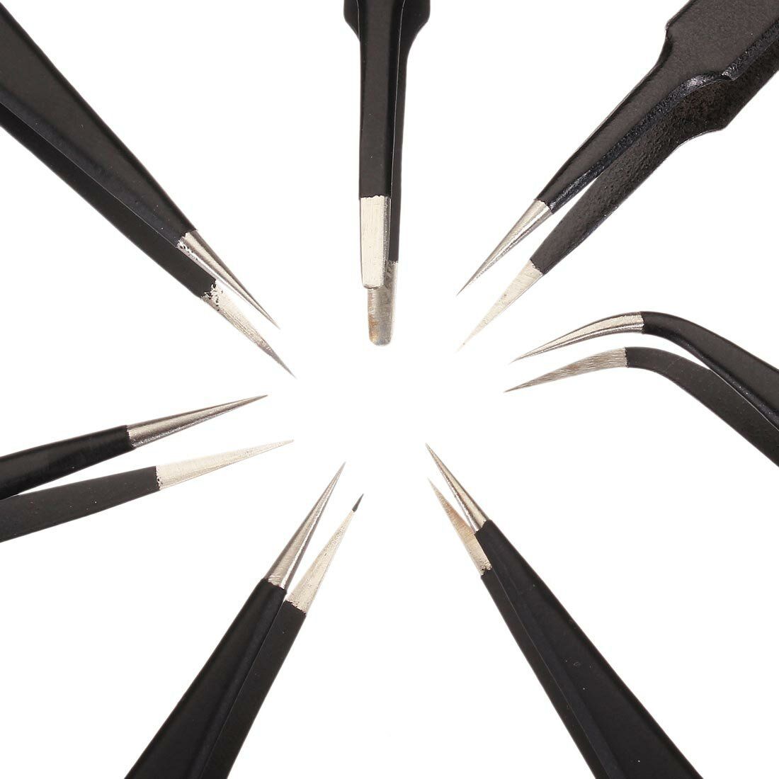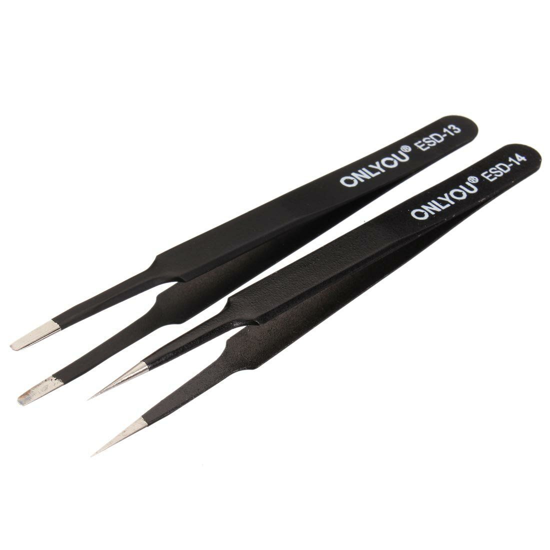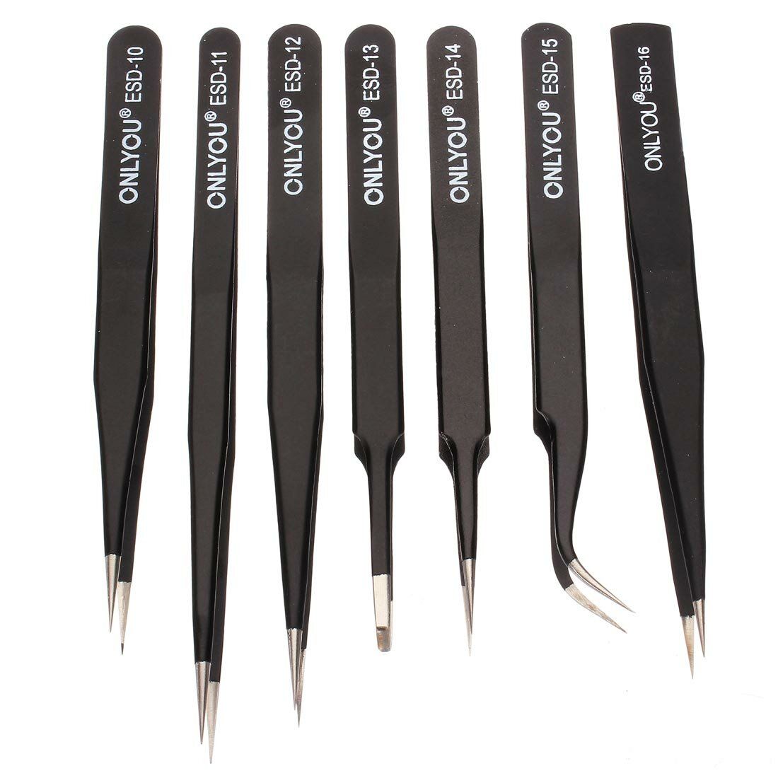 Brand: ONLYOUModel: ESD-10/11/12/13/14/15/16Material: Stainless SteelSurface treatment: processed in high temperature and planting antistatic material Type of tip: pointed and curved Weight: 155GSize:110mm~140mm are availableFeatures:1. Made by the high quality stainless steel2. Antistatic, Anti-magnetic and anti-acid3. Cutting-edge parts of pure manual polishing,fine workmanship4. Processed in high temperature and planting antistatic material5. Tips after a long time use is still super straight.6. 7 pcs, 6 sizes,suitable for all kinds of electronic components, convenient, improve the work efficiency.7. Use Swiss technology, precision machining, professional used for SMD, chip, jewelry, eyelash extension,electronic repairing, leather work ect.
