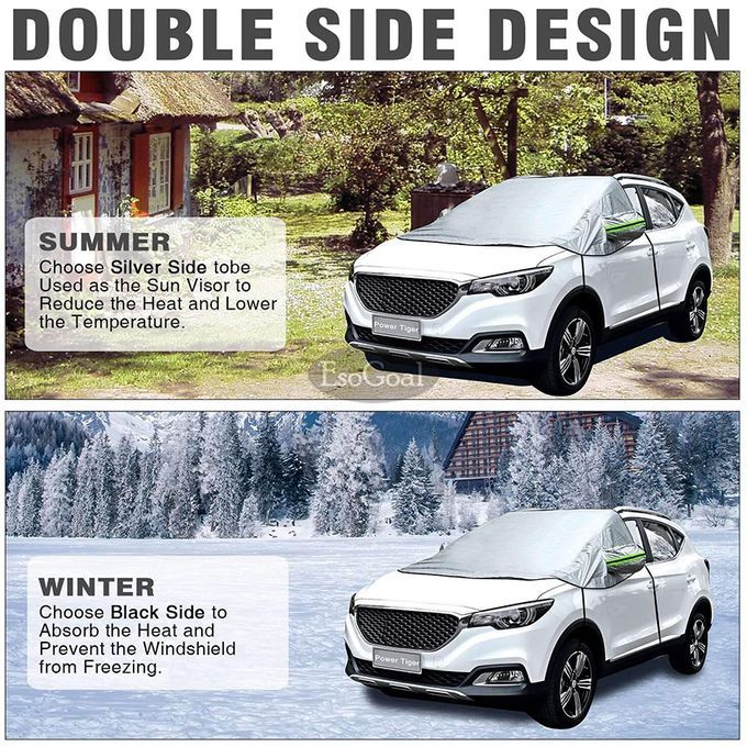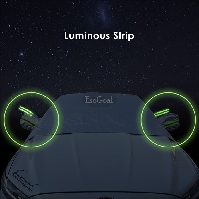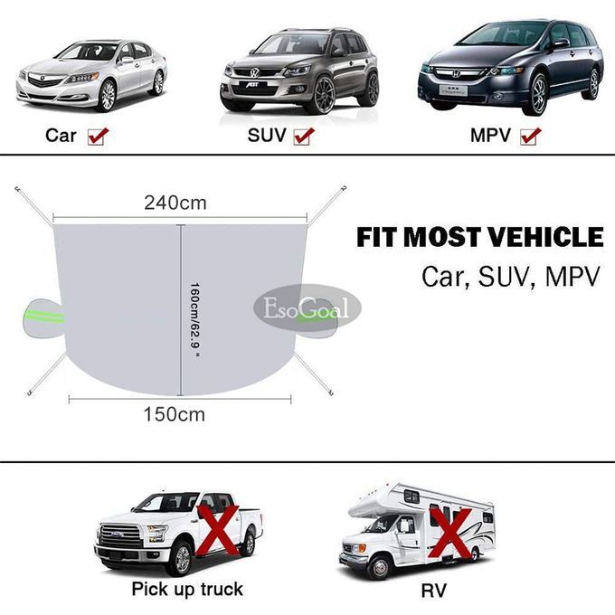 Welcome to the treasure box brand EsoGoal, we have all the products you want.we are committed to providing the best and most comprehensive products, the most practical design, and the most timely after-sales service. If you have any questions during the purchase, please feel free to contact us. Have a pleasant shopping. Full Coverage: The overall size of the cover is 240x150cm and it provides ample coverage and protection to the windshield and even front windows of most vehicles.Upgraded 4-layer Protection: The windshield sun shade is made of waterproof and UV proof heavy duty PEVA fabric with aluminum foil lamination on one side and micro cotton lamination on the other; reflective straps enhance safety.Anti-theft Design:Our cover features two tuck-in flaps with foam rods that can be tucked into the doors and car frame, so it cannot be easily stolen.All Season Protection - Effectively protects your car windshield from dust, dirt, debris, bird droppings, snow, frost and sunlight. Thermal shield traps heat below cover insuring an ice and snow free windshield every morning. IMPORTANT NOTEDear, We appreciate your preference and take the opportunity to let you know that your purchase is very valuable to us. Your satisfaction and positive feedback is very significant to us.If you like it, Please give us 5-star.If for any reason you are not satisfied with any of our products or have any questions regarding the use of the product, please contact us before raising a claim, Please be assured that we will be responsible for all the products of our brand. Dear, have a nice day!