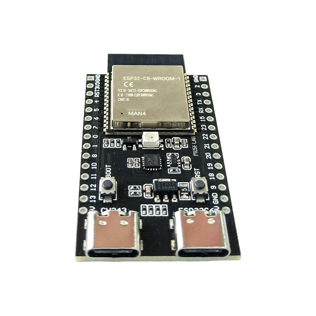 The ESP32- development board is a development board from MuseLab based on the ESP32--WROOM-1 module. It has a USB to serial port and full colour RGB on board for quick prototyping and development.