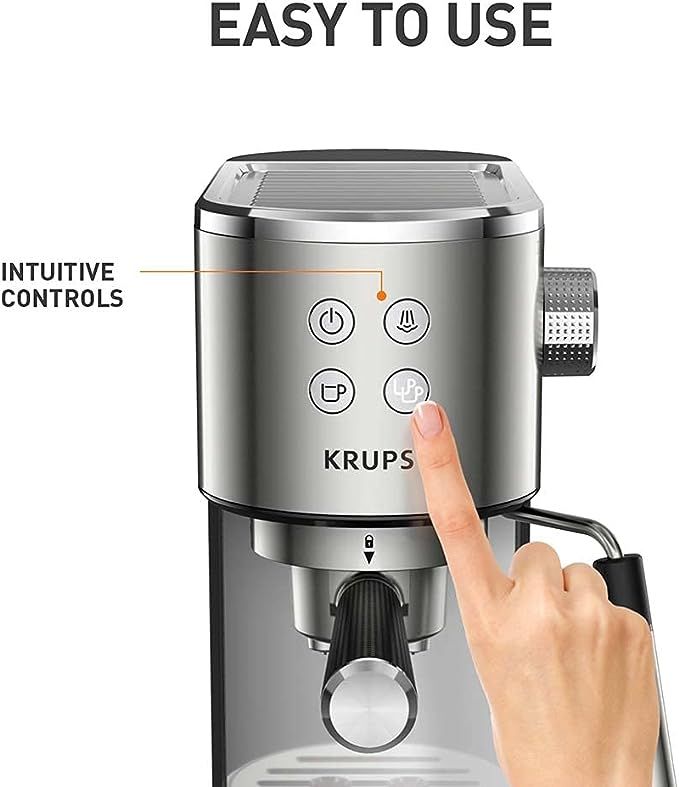 Enjoy barista-quality performance in a stylishly small footprint with KRUPS Virtuoso. Boasting an exceptionally compact design in sleek stainless steel, our premium pump espresso coffee machine offers the perfect blend of convenience, durability, and elegance. A simple four-button interface makes this machine incredibly intuitive to use, with automatic flow stop that cuts off the shot at the right time for espresso that's rich and perfectly balanced. Prefer your coffee with milk? The high-performance manual steam nozzle puts you in control, producing a dense velvety milk foam for a luxuriously creamy cappuccino to rival your local coffee house. The nozzle also dispenses hot water for tea. Espresso making is a precision art, but KRUPS technology makes the process effortless. Combining our patented Thermoblock system for hot water on demand with a professional 15 bars of pressure for optimal flavour extraction, Virtuoso delivers a full-bodied espresso with uniform crema in just 40 seconds. So, you can enjoy coffee shop-quality results without the wait. The versatile filter holder has single and double options to vary the strength or brew one or two cups of ground coffee at once. It's also compatible with soft pods for coffee your way. The 1L water tank is easy to remove for refills - as is the drip tray, which makes emptying and cleaning a breeze. And Virtuoso comes with all you need to create cafe-style coffee at home, including a spoon with tamper to measure your grounds and pack them tightly to extract the most flavour. There's even a cup warmer to preheat your cups like a pro.