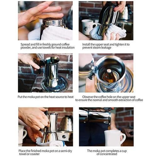 EASY 3-STEP OPERATION: Step 1. Fill the lower pot with water, Step 2. Fill the stainless steel funnel with coffee grounds, Step 3. Put on a cooktop and heat up with small or medium power setting, when it stops the gurgling sound after 5 minutes, you can start enjoying a fresh cup of espresso instantly.