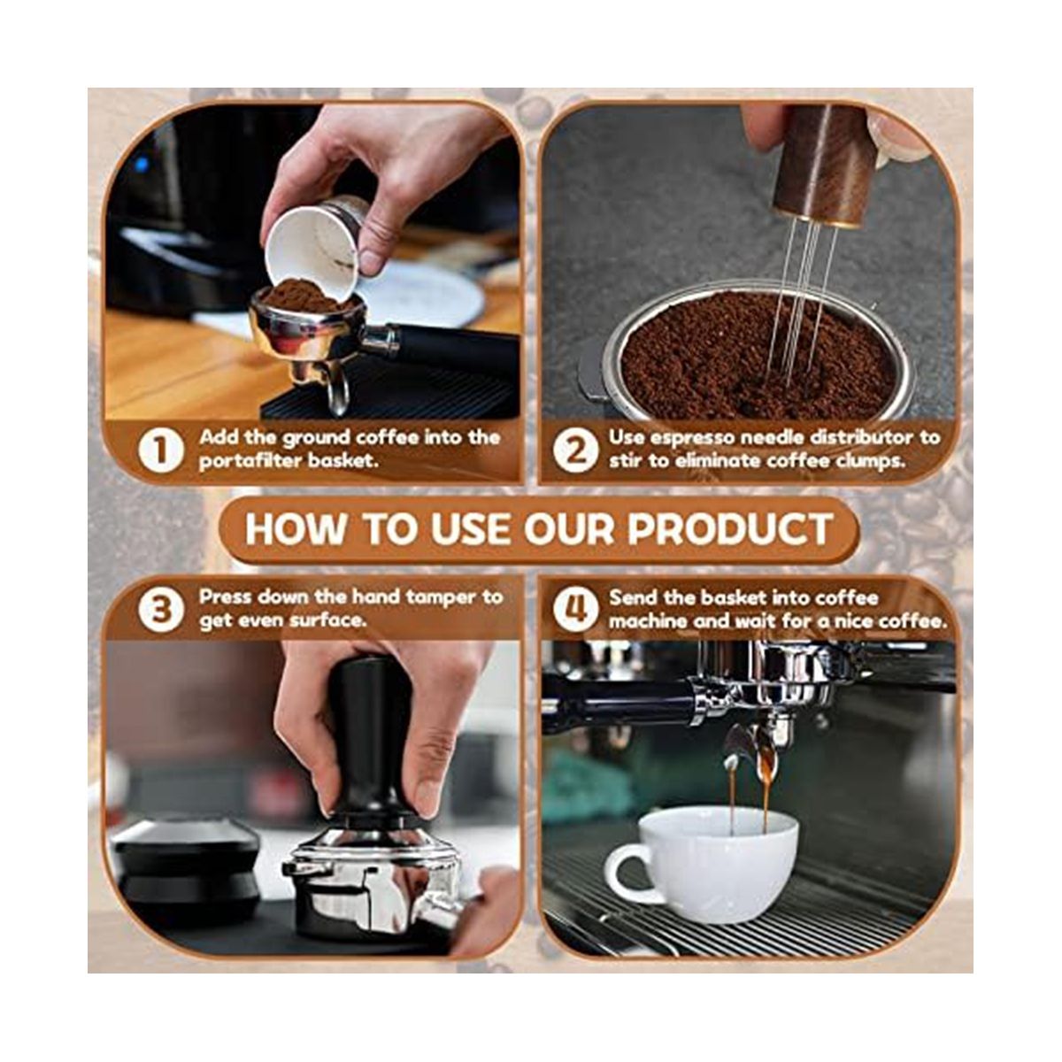 Espresso Tamper Set: The distributor tool eliminate coffee clumps while the espresso tamper level the ground coffee in your filter handle. These two tools are premium and portable, ensuring better flavors for your coffee.Coffee Making Good Assistant