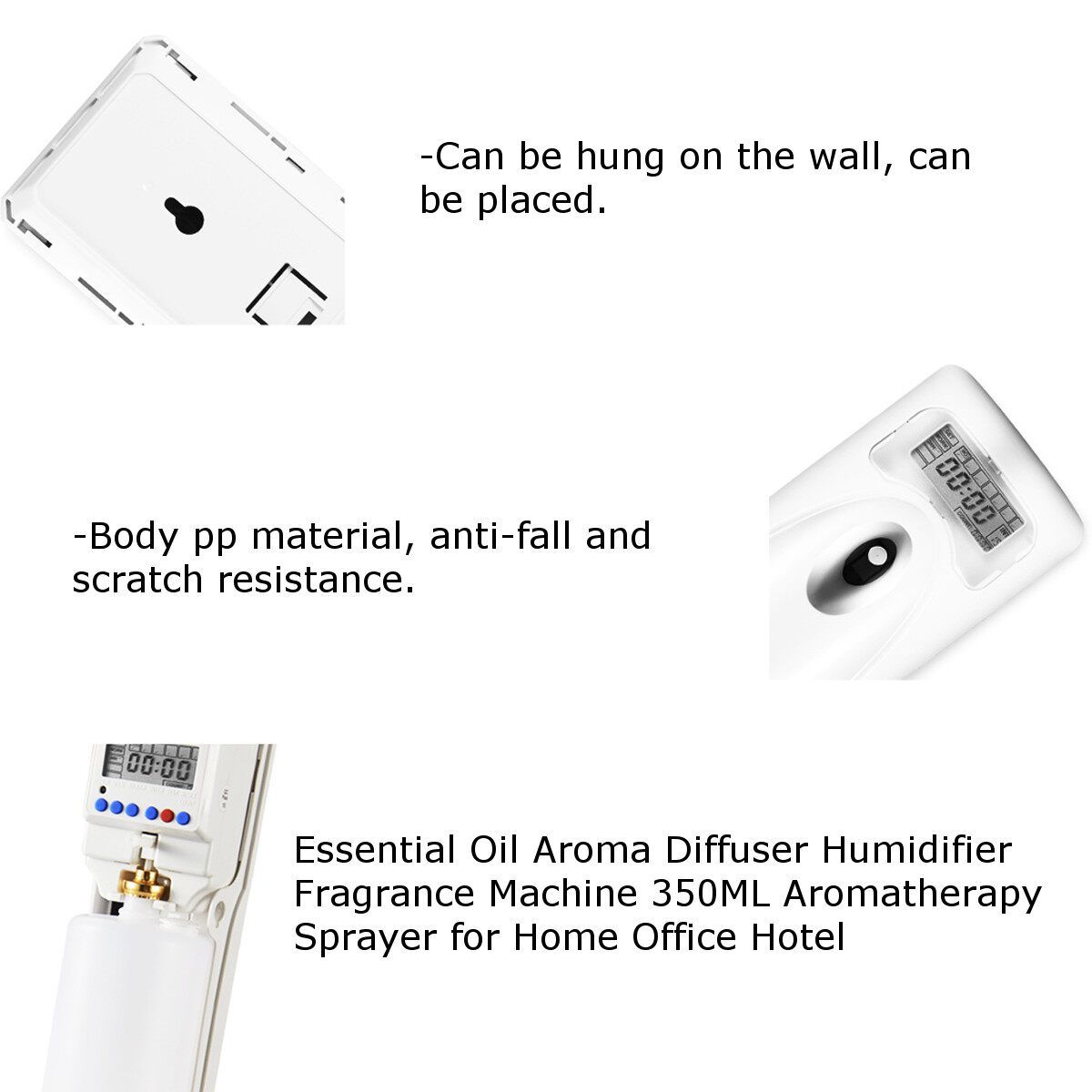 Essential Oil Aroma Diffuser HumidifierFragrance Machine 350ML Sprayer For Home Office Hotel Specifications: Item type: Aroma Fragrance Machine Model: 6008A Brand: Intel : White Size: 8x8.5x21cm/3.12x3.32x8.19inch Material: Applicable : 5 batteries, 3 sections(not include) (1cm=10mm=0.39inch) Measurement Details in the attached picture. Package included: 1x Aroma Fragrance Machine 1x English manual 1x Essential oil bottle(No essential oil) Feature: -100% and high quality. -Can be hung on the wall, can be placed. -Body material, anti-fall and scratch resistance. -Easy to operate LCD panel, LCD display, complete function keys, intuitive and easy to use, easy to use. -Ultra-fine spray and fragrance, using spray precision technology, the nozzle can be recycled 50,000 times. -Silent atomization, decompression and sleep, relax. -Efficient and energy-saving, you can check the number of fragrances, the is insufficient to automatically remind. Notice -Please allow slight deviation of measurement due to manual measurement. -Due to different monitors and different light, the picture may not reflect the actual of the item. -Please consider the actual sizes in the listing as the pictures are generally enlarged to show detail. Ifyouhaveanyquestions,pleasecontactus.