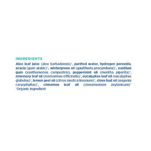 Aloe leaf juice (aloe barbadensis)*, purified water, hydrogen peroxide, acacia (gum arabic)*, wintergreen oil (gaultheria procumbens)*, xanthan gum (xanthomonas Campestris)*, peppermint oil (mentha piperita)*, rosemary leaf oil (rosmarinus officinalis)*, eucalyptus leaf oil (eucalyptus globulus)*, lemon peel oil (citrus medica limonum)*, clove bud oil (eugenia caryophyllus)*, cinnamon leaf oil (cinnamomum zeylanicum)*