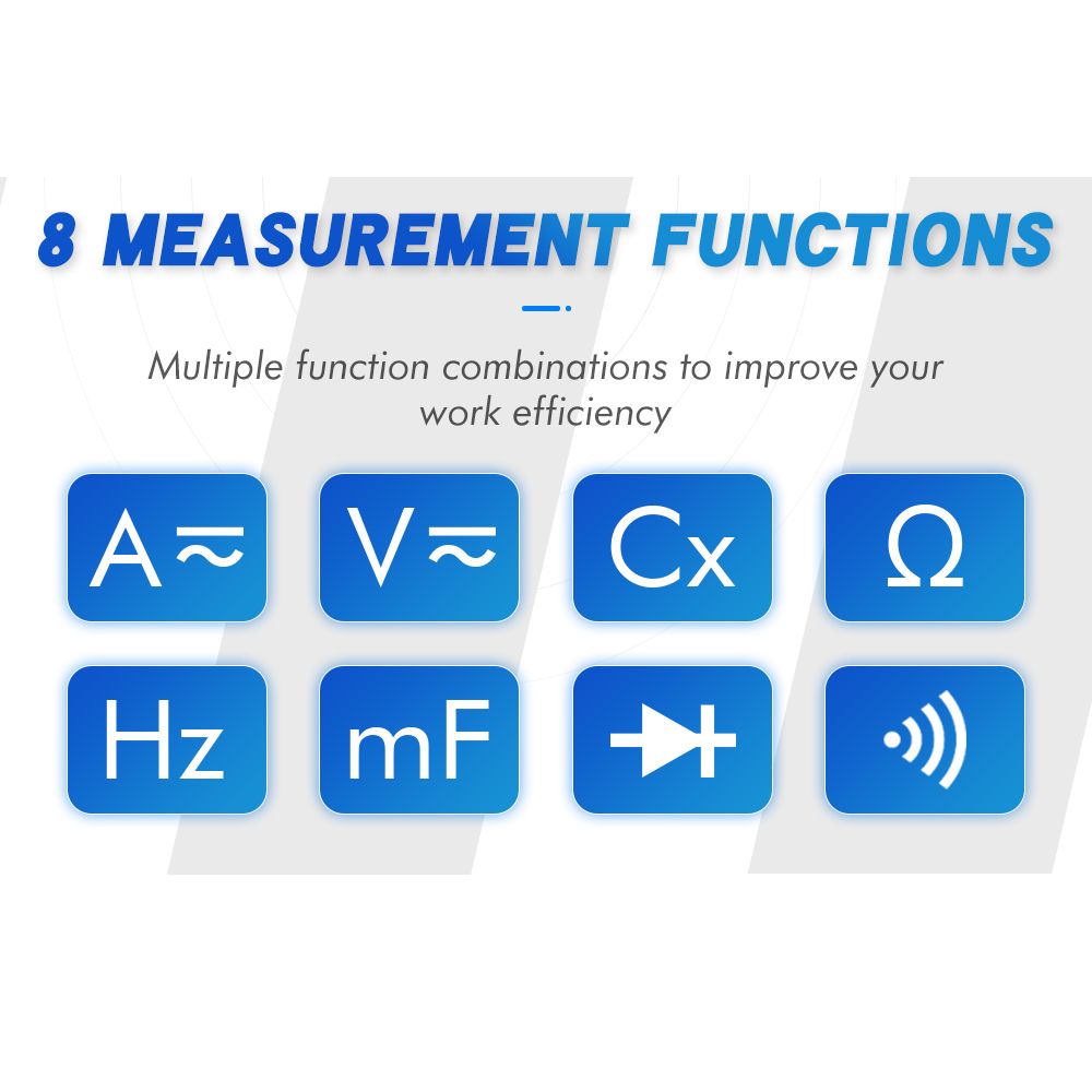 Multimeter measurement functions: AC/DC voltage, AC/DC current, resistance, capacitance, frequency, duty cycle, diode test, continuity test.