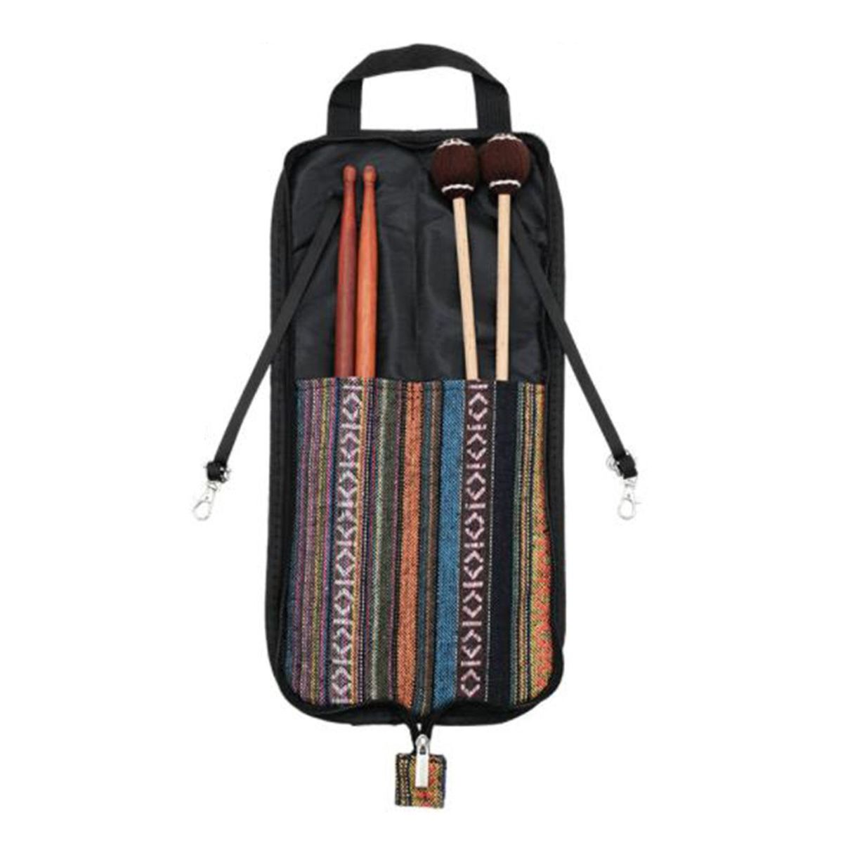 DURABLE: The drum stick bag is made of high quality cotton, sturdy and durable, with ethnic pattern design, beautiful and fashionable.2 COMPARTMENTS: 2 compartments for drumsticks, sticks, drum brushes, can hold 4 to 6 pairs of drumsticks (depending on the thickness of the drumsticks).HANDLE: Comfortable grip, easy to carry.HOOKS: The Drumstick Kit is designed with hooks to hanging from the drum kit for quick access during gigs or practice.ZIPPER: The mallet bag can be folded and then zipped, the zipper is smooth, your mallet will not fall off, it is safe to use.
