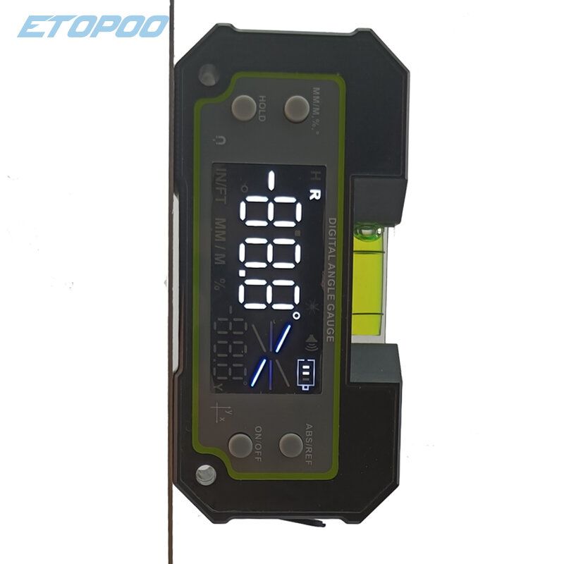 Features:LCD digital display for clear and fast reading of measurement data.Compact and lightweight, firm and practical, high precision.Easy to use and carry, has a long service life.With built-in magnets in bottom and back, it will conveniently cling to the object measuring workpiece.Function: absolute angle measurement (automatic switching between two-axis mode and single-axis mode), relative angle measurement, upright and inverted display, dual-axis mode (displaying the angle of X and Y axes, if the angle exceeds the double axis inclination +/- 45 degrees, it will automatically switch to single axis mode).
