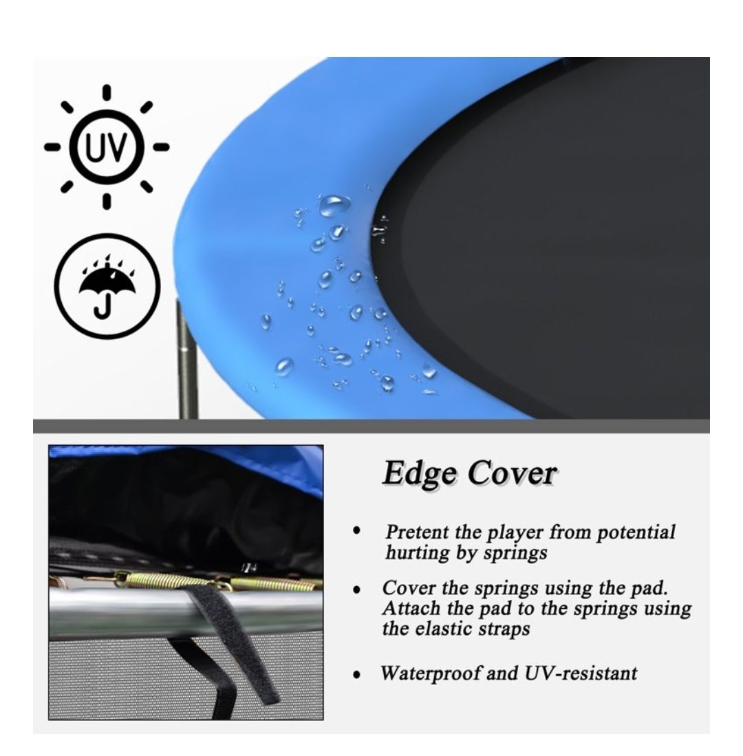 Five U-Shaped Legs : The legs are arranged and assembled evenly under the trampoline base. They offer enough stability and support for the whole trampoline.Solid security: 14-Foot round trampoline with 9-piece 6ft high safety enclosure.High quality mat: Premium micro woven polypropylene trampoline mat. And it is made of tear-resistant PE material, which is durable, and closely connected to protect kids while jumping.Weight capacity is 330lbs. Heavy duty PP jumping mat is stitched perfectly well. All springs and top rails are designed for fixing the whole trampoline. It offers you a sense of secure feeling while you jump on the mat.Convenient Zippered Entrance: Featured with double-headed zipper and protection buckles, this replacement trampoline enclosure net is specially designed for kids to use. All these details are kid-friendly for daily entrance and
