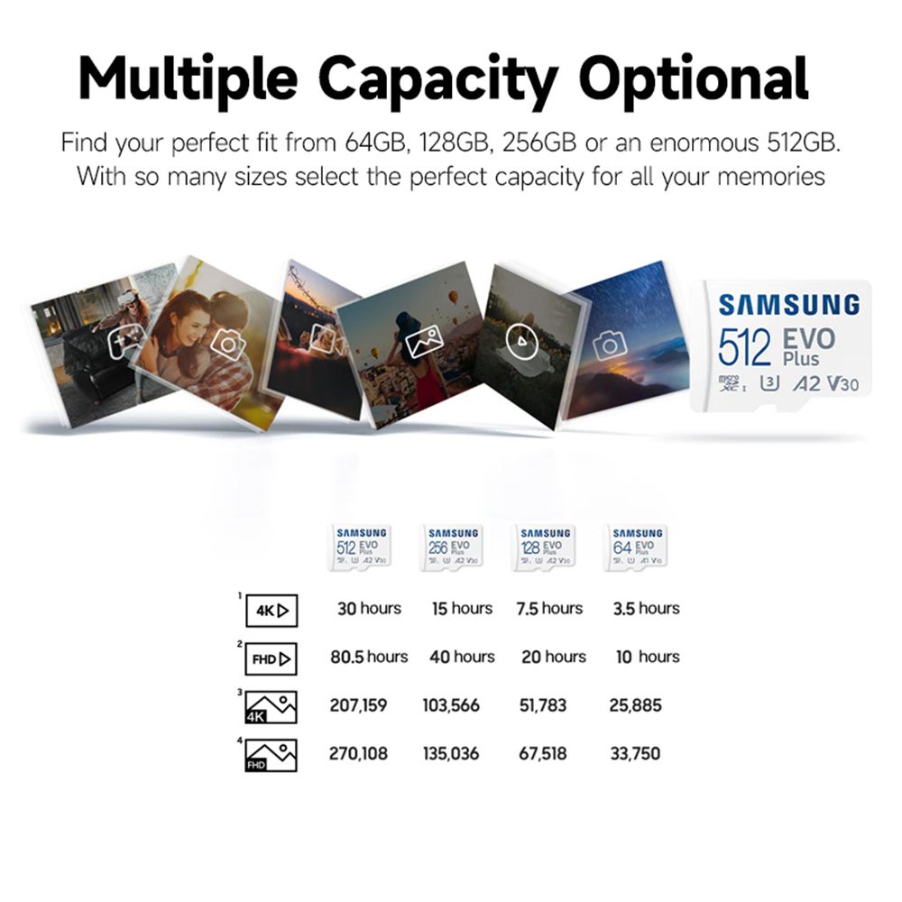 Even with huge files, EVO Plus is incredibly quick with superfast U3, class 10 rated transfer speeds of up to 130MB/s. Big apps load and run smoothly, while 4K video remains sharp with A2, V30, and UHS-I Interface.(x64GB model only supports U1 A1 V10 speed level)